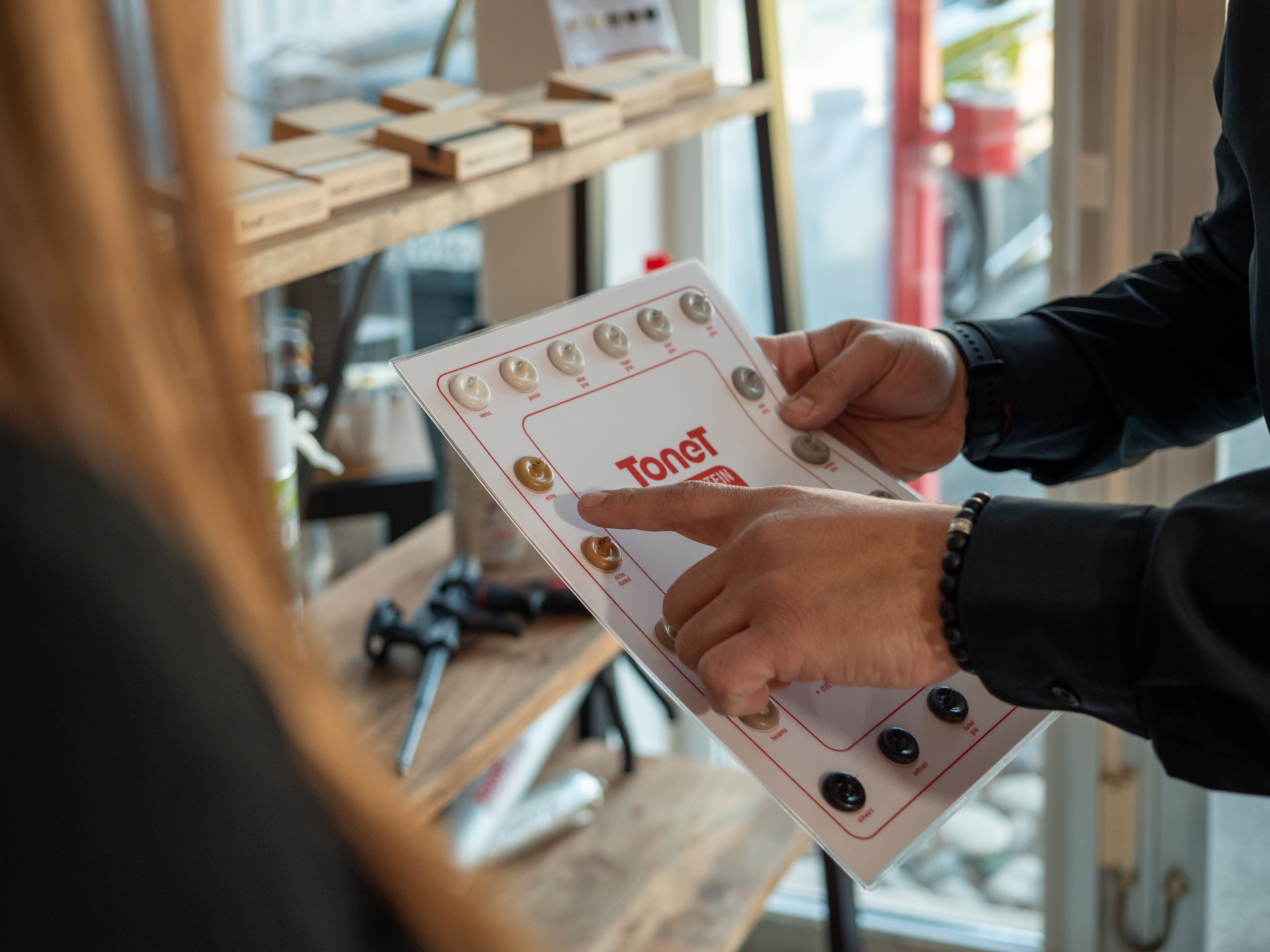 Wenn man beim Kunden so empfangen wird, mit einem Augenzwinkern, dann gehört man dazu. Diese Frage sei ein grosses Kompliment für ihn, freut sich Andreas Inauen, der seit 1992 die Kantone SG, AI, AR, GR und das Fürstentum betreut. Er ist ein gefragter Mann: 90 % seiner Besuche vereinbart nicht er mit den Kunden, sondern sie mit ihm. Nach seiner Lehre zum Möbelschreiner und ein paar Jahren als Küchenbauer habe er sich als 27-Jähriger auf eine Stellenanzeige beworben, mit der ein «charakterfester … und engagierter … Verkäufer für den Aussendienst» gesucht wurde. Was hat ihn über all die Jahre im gleichen Job gehalten? «Es ist eben nicht der gleiche Job, er hat sich laufend verändert, ist vielseitiger, die Produktpalette grösser, die Anwendungstechnik spannender geworden. Ich lerne heute noch dazu». Weil Andreas Inauen von zu Hause aus und weitgehend selbstständig arbeitet, hat er sich eine Werkstatt eingerichtet, in der er Muster macht und Anwendungen testet. Dieses Engagement hat ihm viel Respekt und Vertrauen eingebracht. «Dafür bin ich meinen Kundinnen und Kunden sehr dankbar», sagt Inauen. Und macht gerade ein Beizmuster fertig für seinen nächsten Termin.