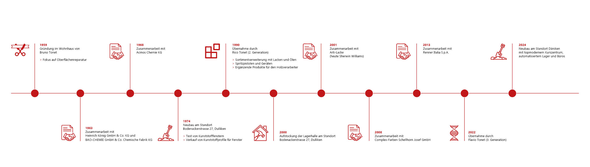 Lorsque Rico Tonet, le fils aîné, reprend l'entreprise de son père en 1990, il continue à développer le secteur des vernis et des huiles. Il se dit toutefois que les surfaces de première qualité ne sont pas seulement le fruit des bons produits, mais aussi de leur application professionnelle. Il introduit donc des appareils et des pistolets de pulvérisation et tient à ce que l'application correcte fasse partie intégrante de l'activité de conseil du service extérieur. C'est ainsi que ses propres vendeurs deviennent des techniciens d'application expérimentés et recherchés. En outre, l'entreprise se transforme en entreprise spécialisée dans les matériaux d'étanchéité et les mousses de polyuréthane, ce qui lui permet notamment de boucler la boucle avec le secteur des fenêtres.
