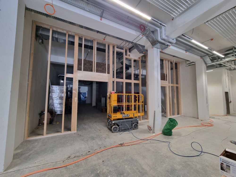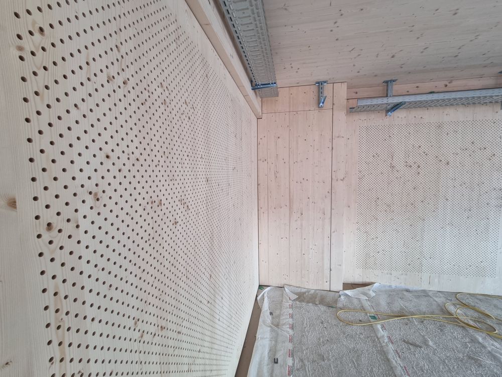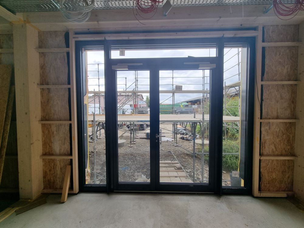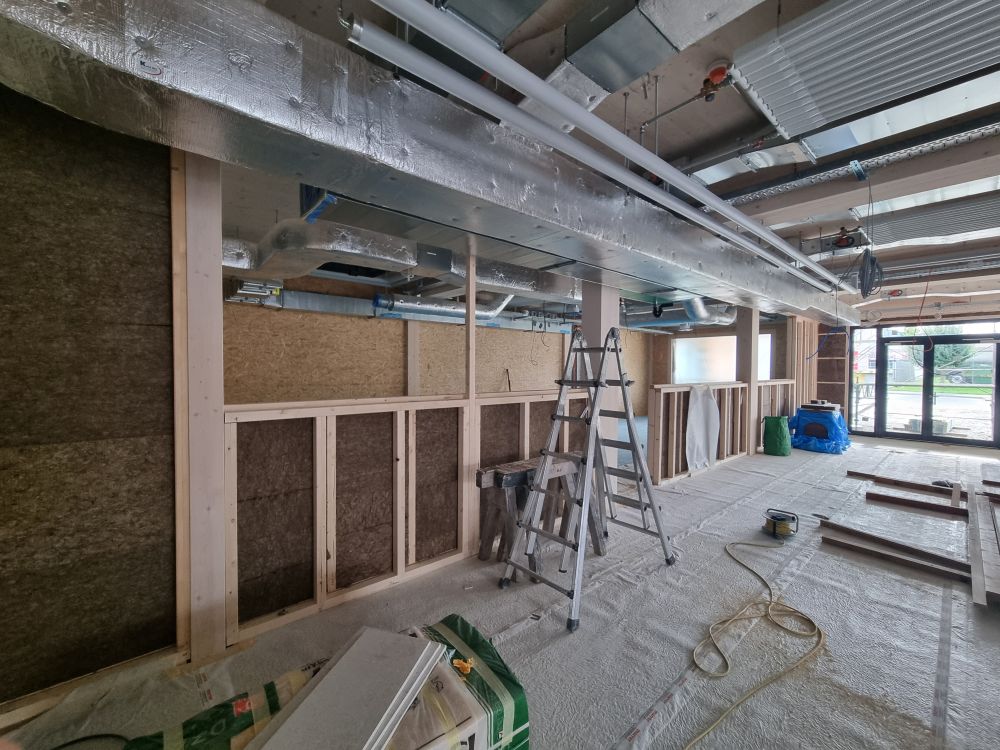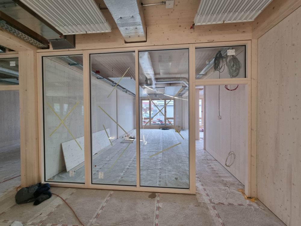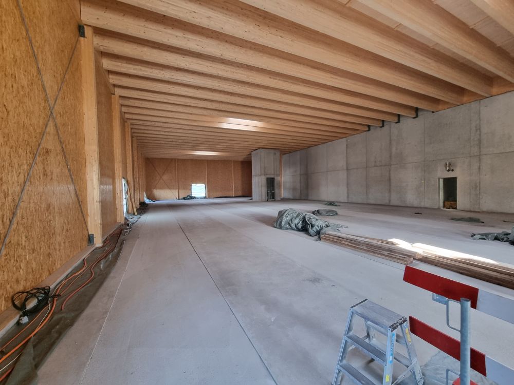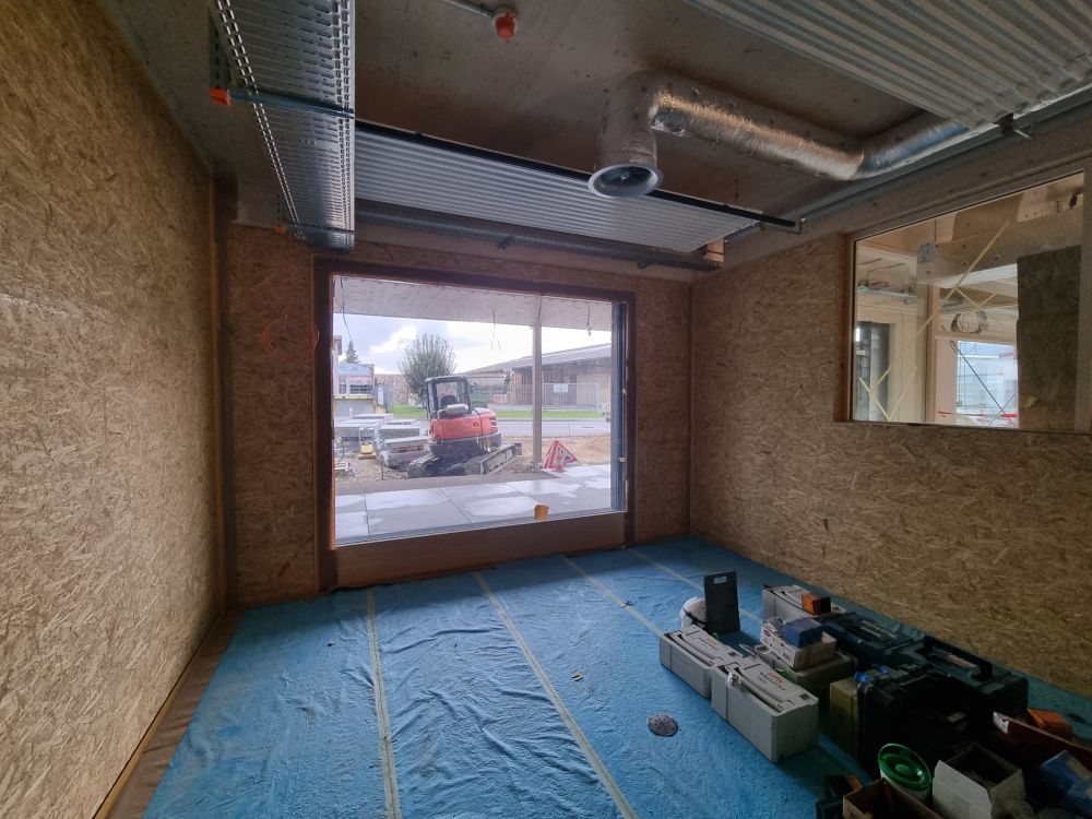À l’intérieur aussi, les travaux avancent à plein régime. Le menuisier apporte la touche finale à chaque pièce – le design choisi devient maintenant clairement visible. Les éléments coupe-feu testés sont opérationnels, et le vaste système de ventilation est déjà en phase d’essai.