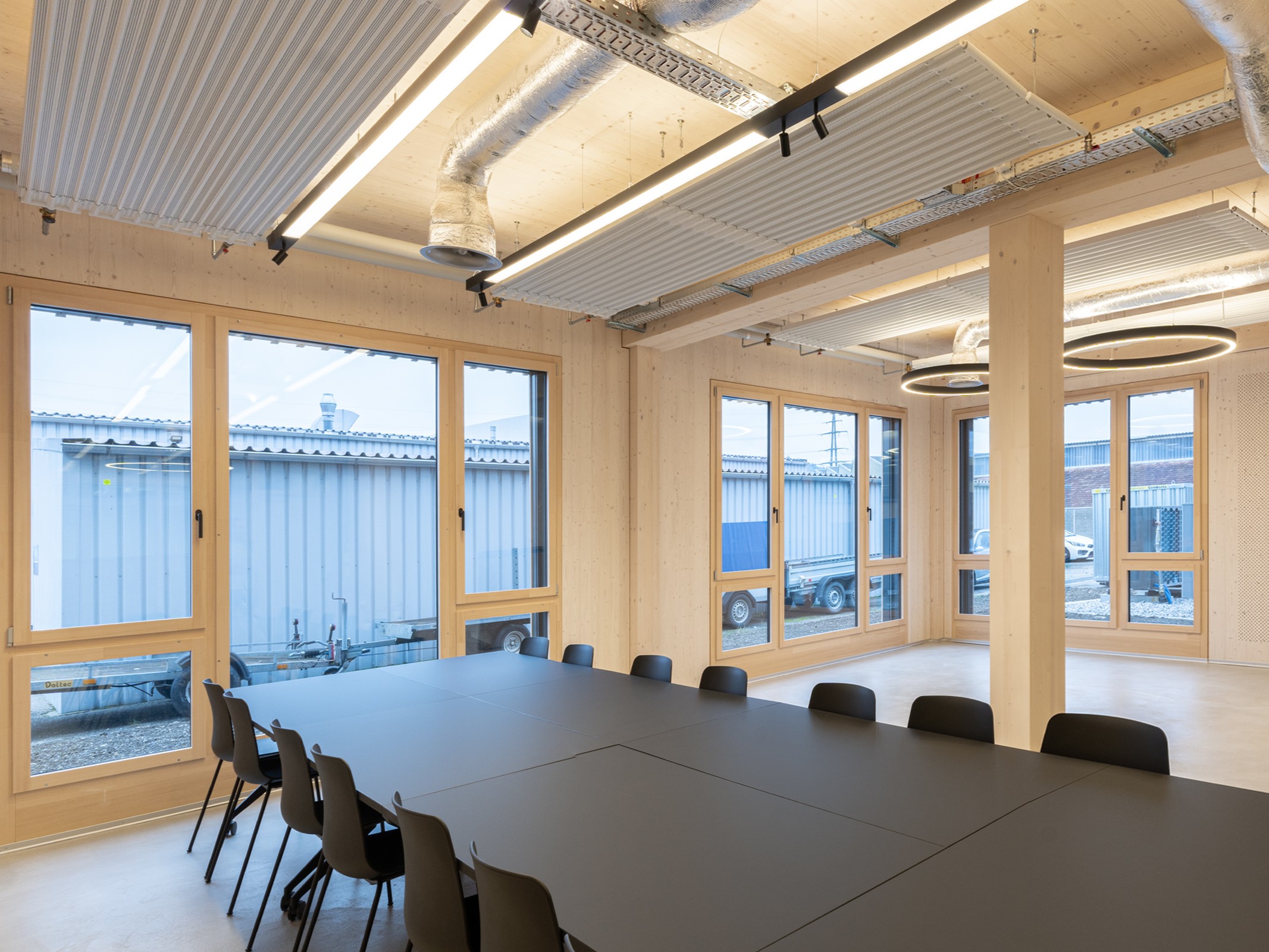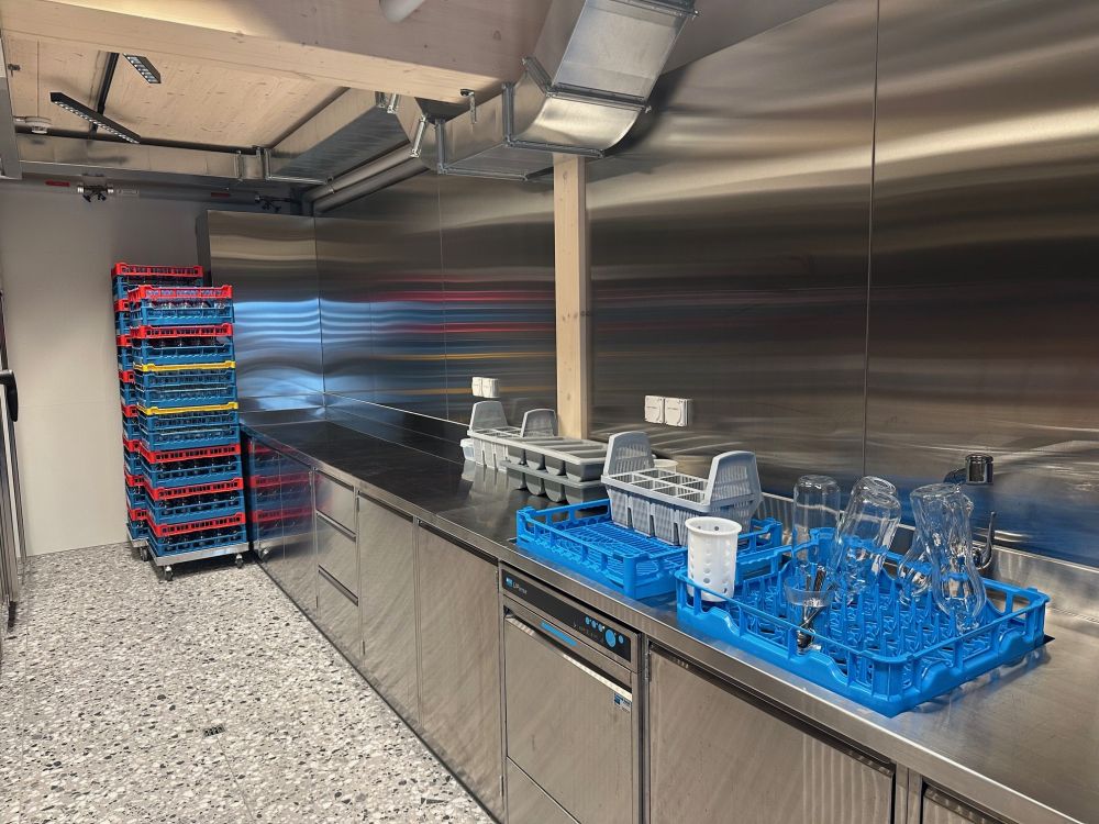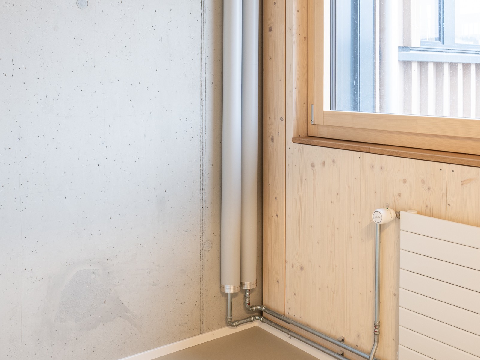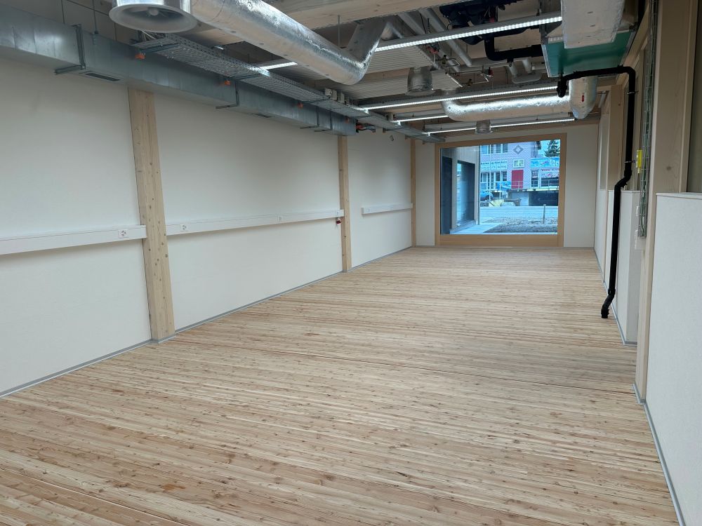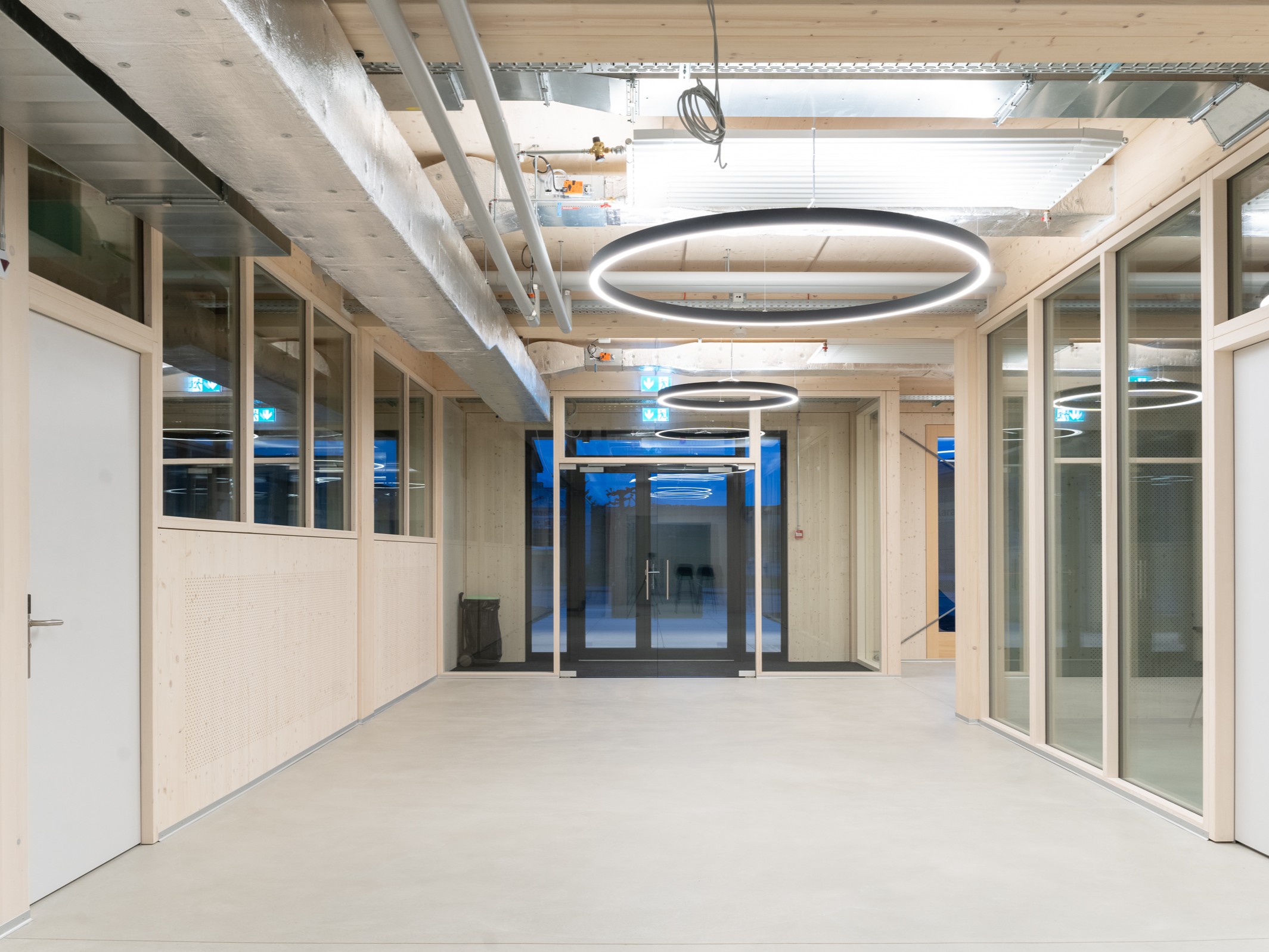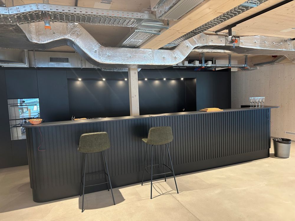 À l’intérieur aussi, les travaux avancent à plein régime. Le menuisier apporte la touche finale à chaque pièce – le design choisi devient maintenant clairement visible. Les éléments coupe-feu testés sont opérationnels, et le vaste système de ventilation est déjà en phase d’essai.