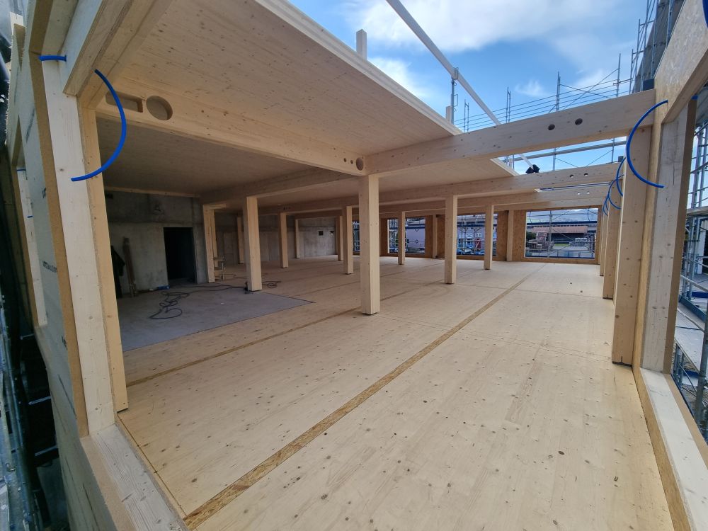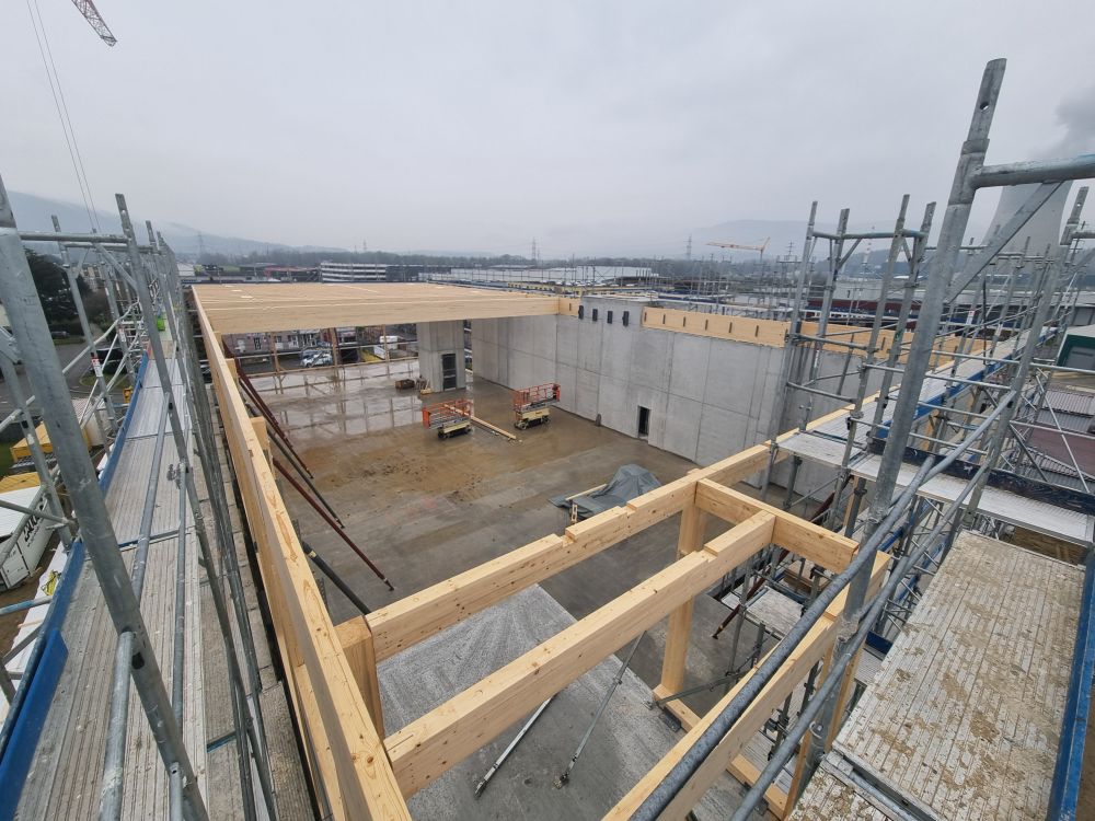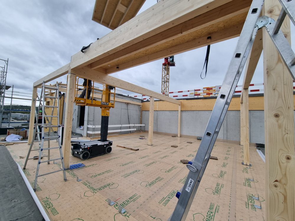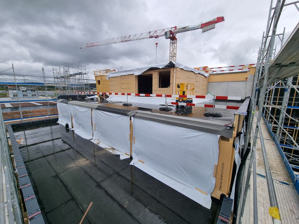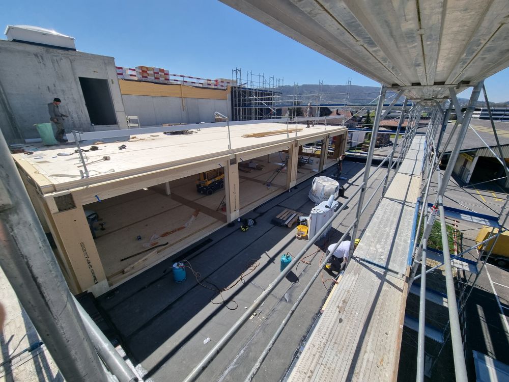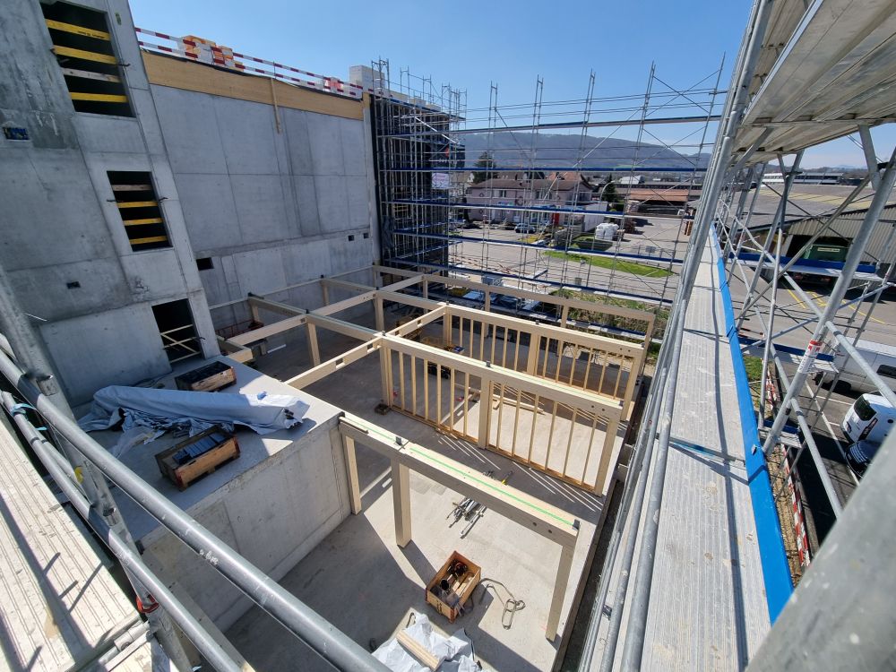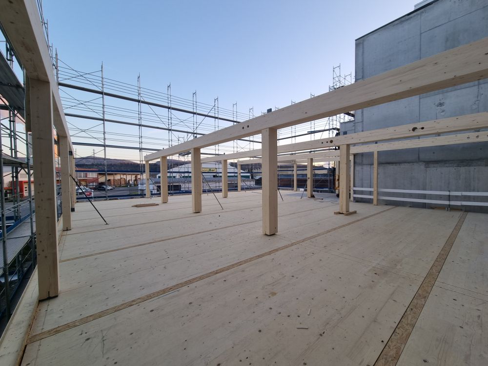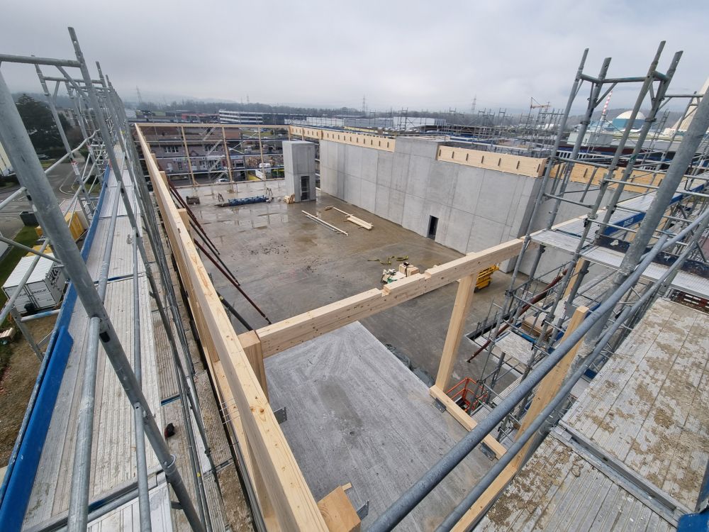 Les travaux sur l'immeuble des bureaux avancent rapidement. La construction en bois est en grande partie terminée, tout comme le toit plat.