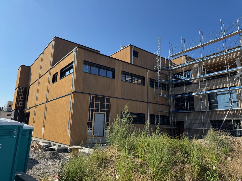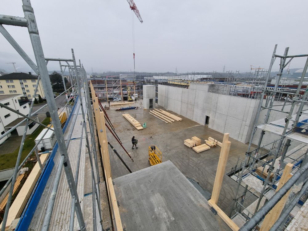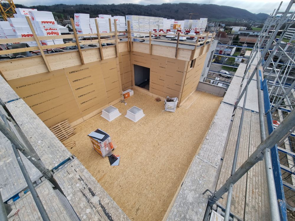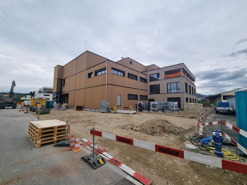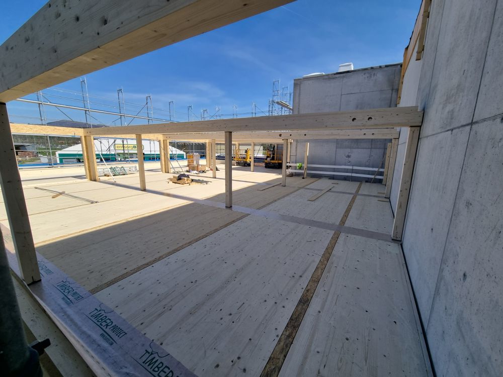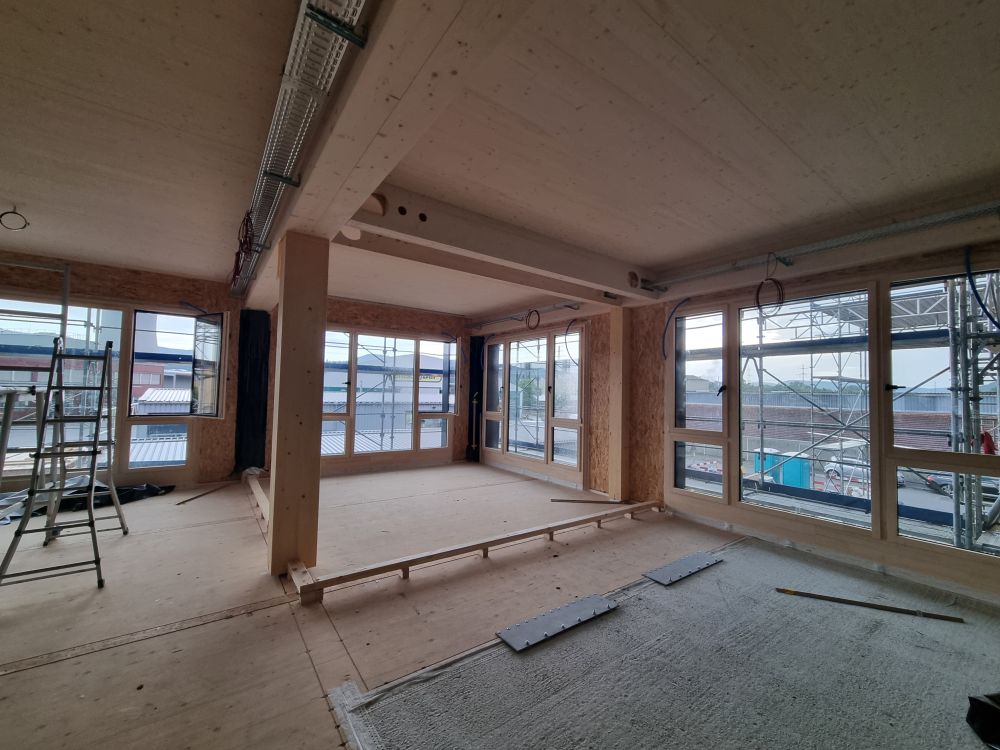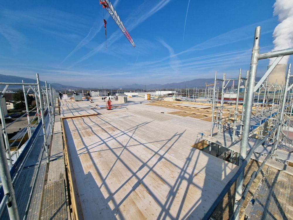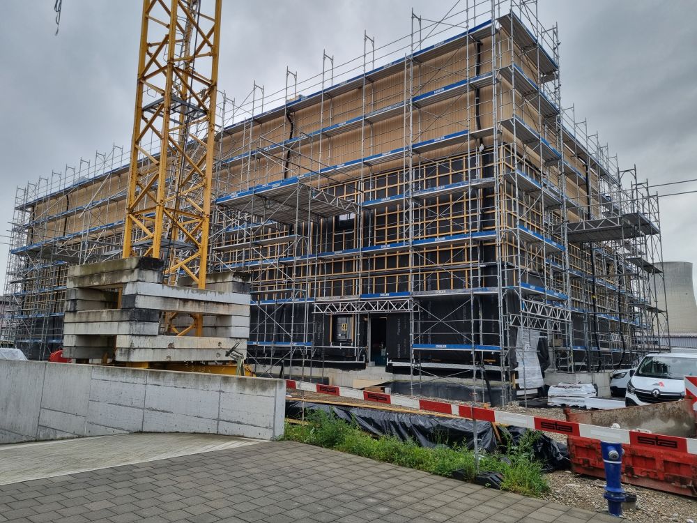 Les travaux sur l'immeuble des bureaux avancent rapidement. La construction en bois est en grande partie terminée, tout comme le toit plat.