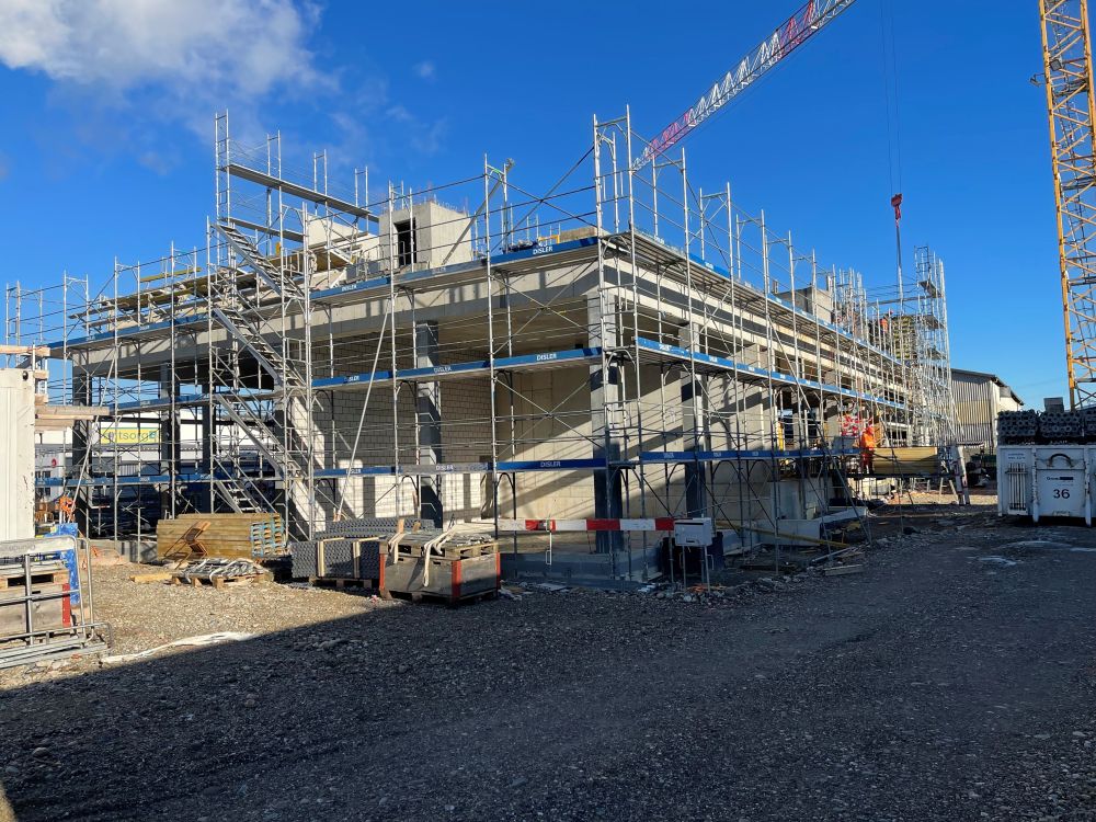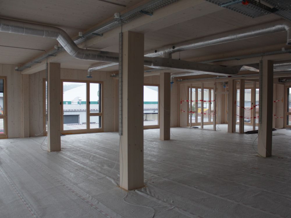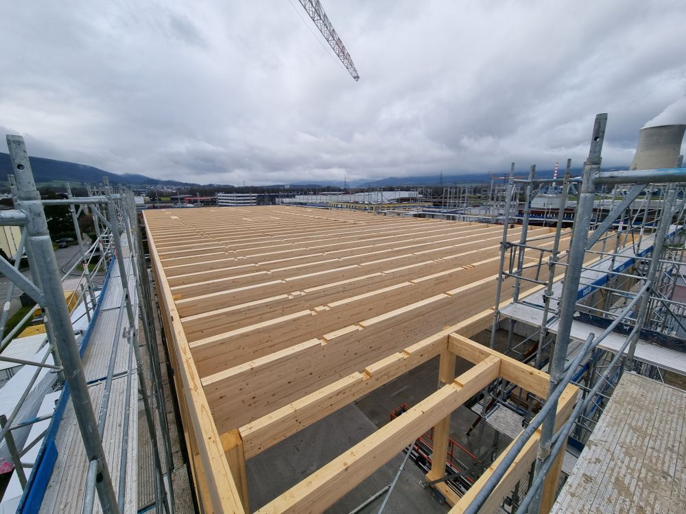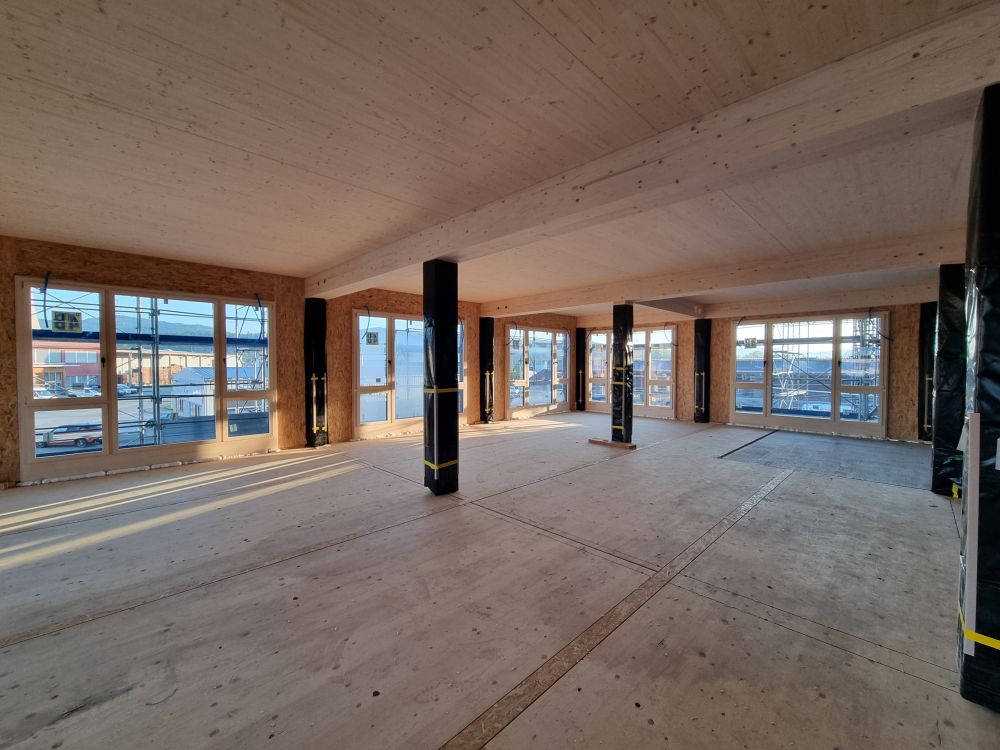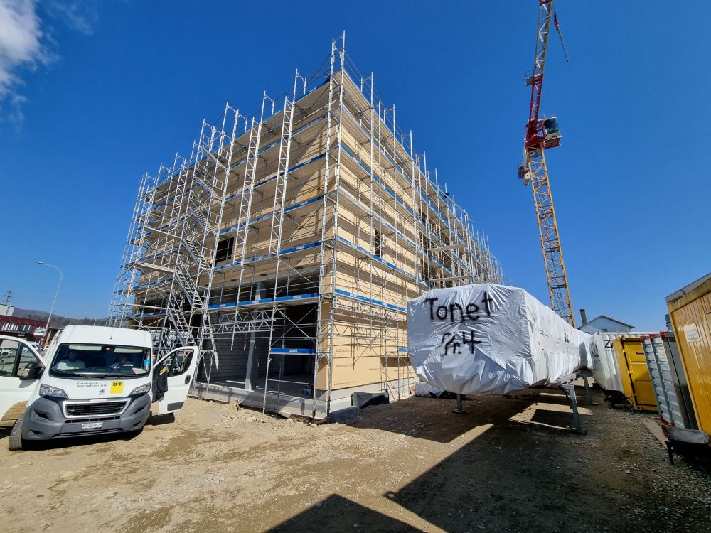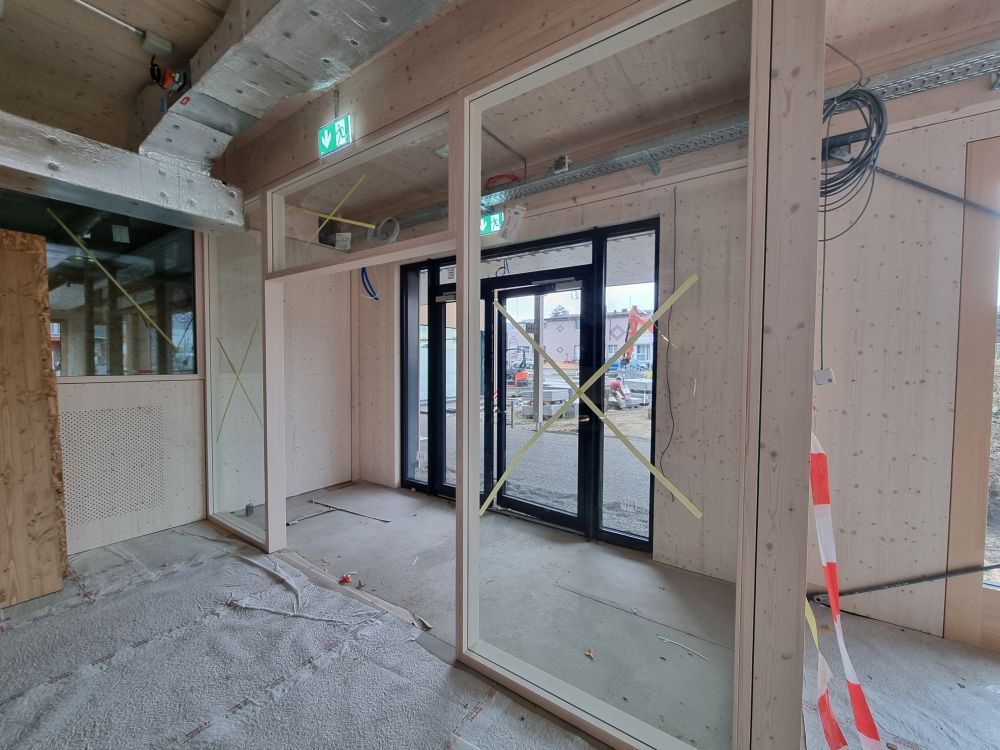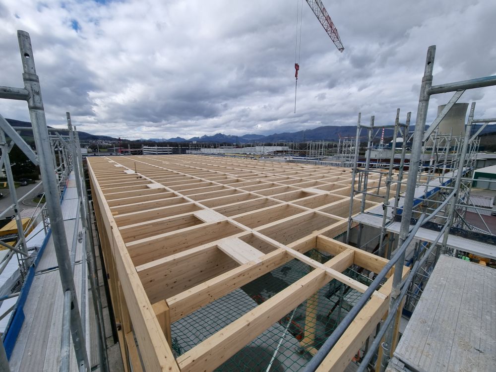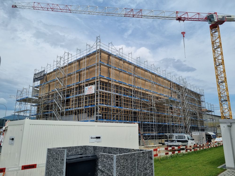 Les travaux sur l'immeuble des bureaux avancent rapidement. La construction en bois est en grande partie terminée, tout comme le toit plat.