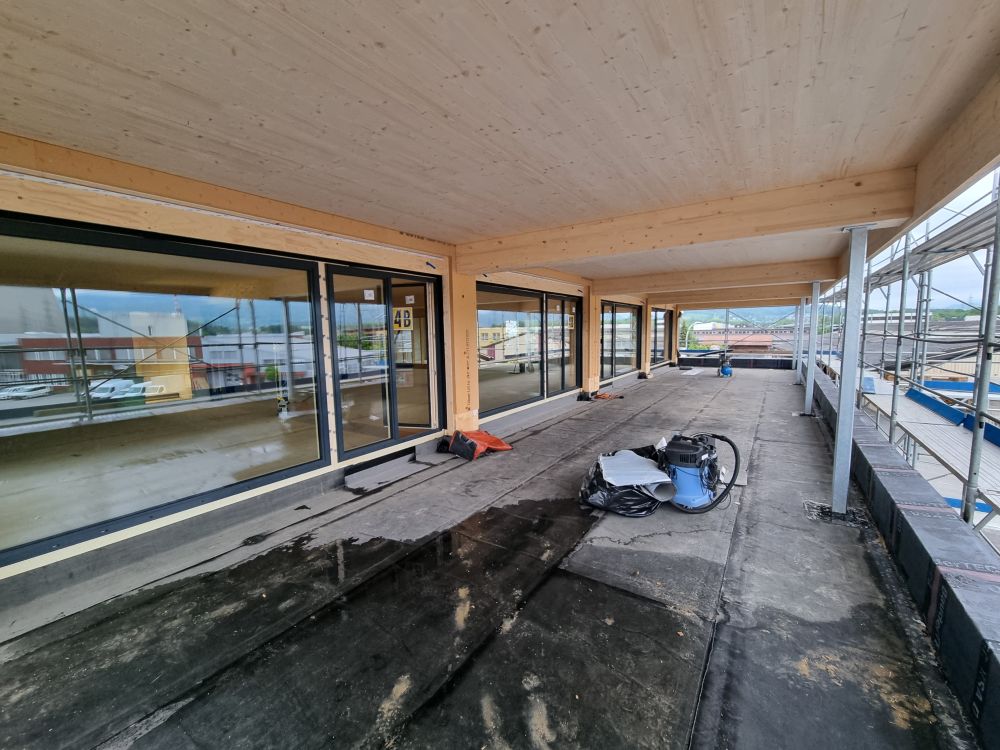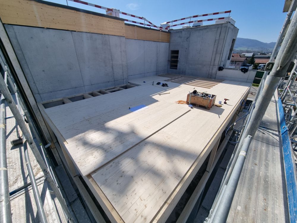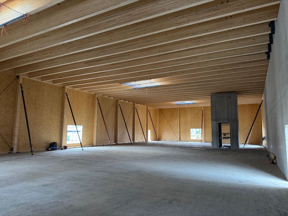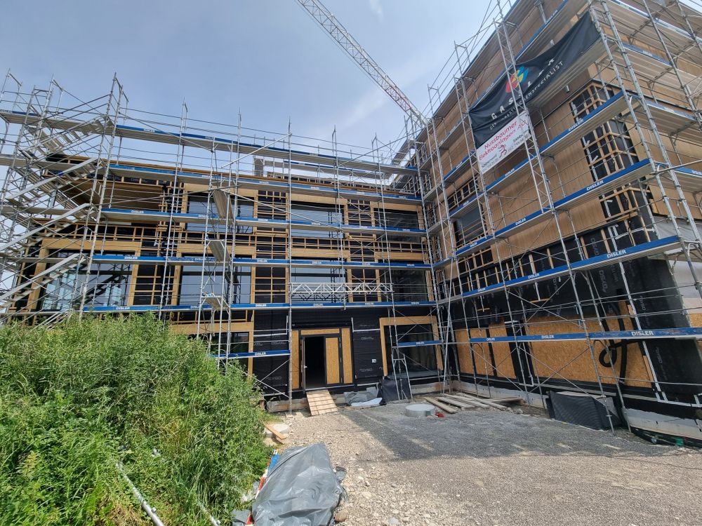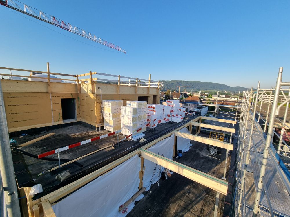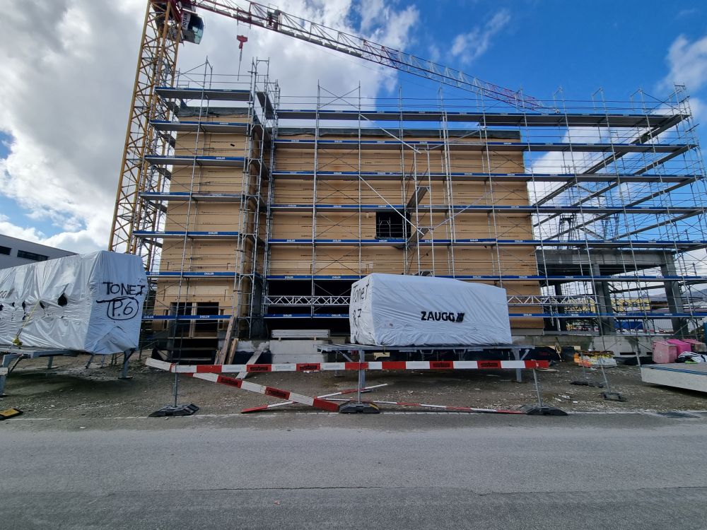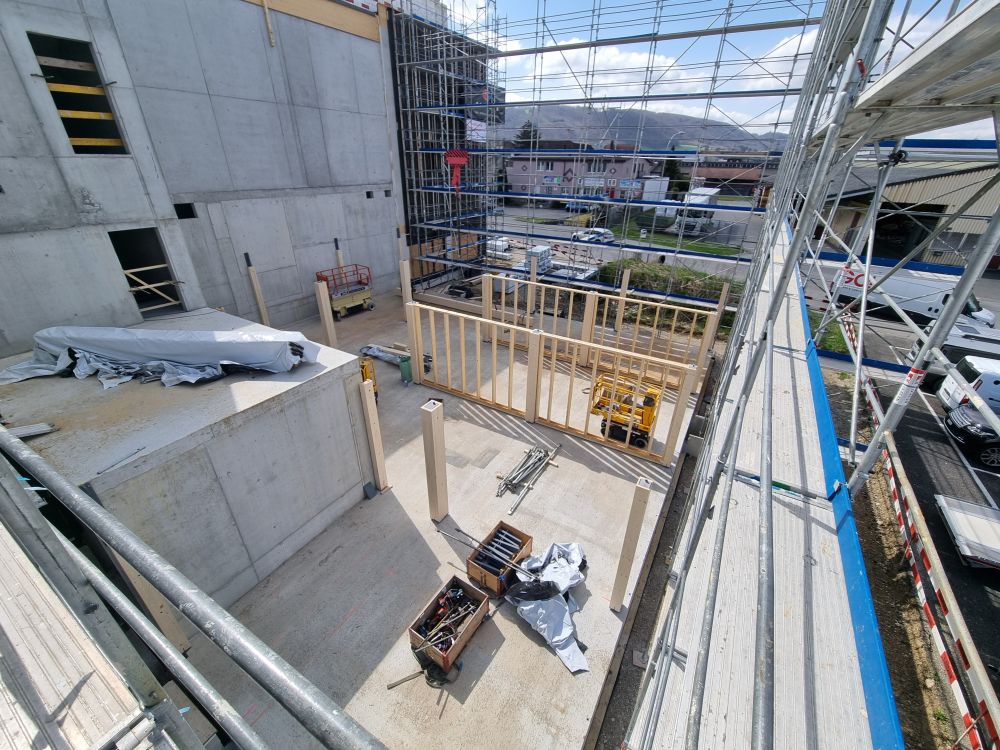 Les travaux sur l'immeuble des bureaux avancent rapidement. La construction en bois est en grande partie terminée, tout comme le toit plat.