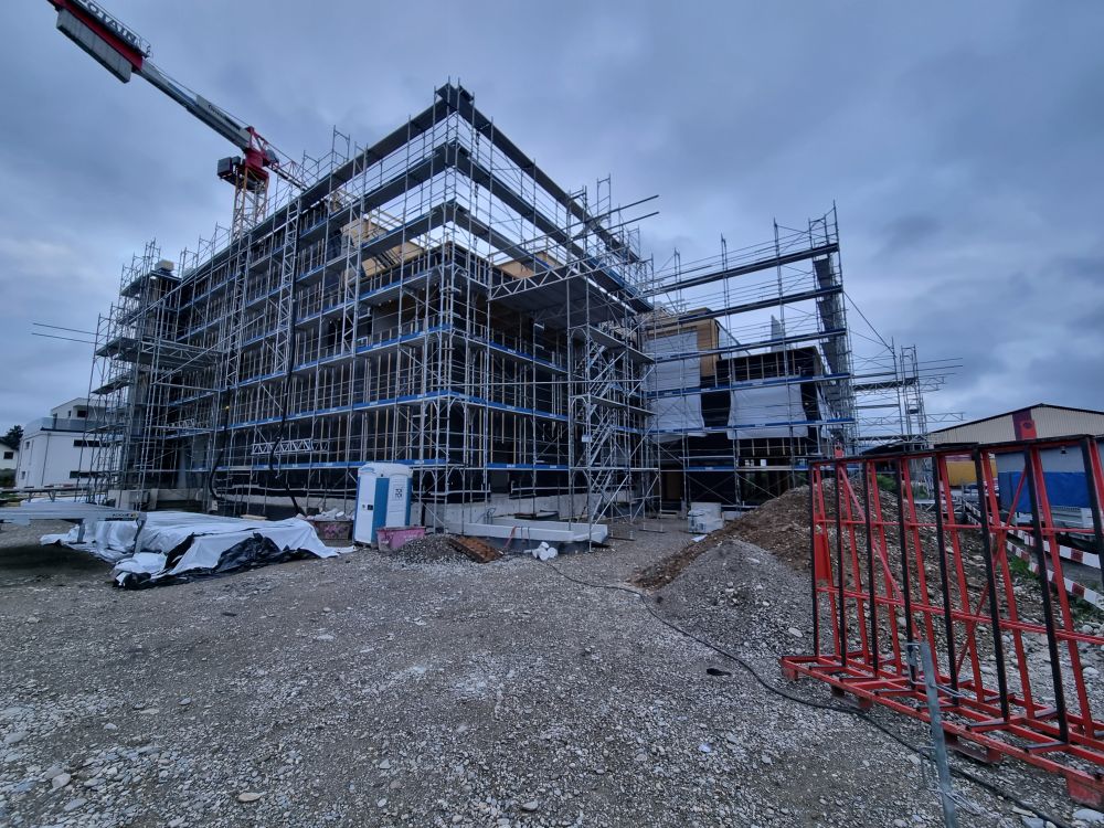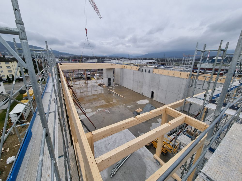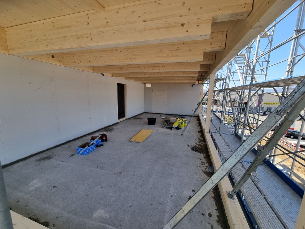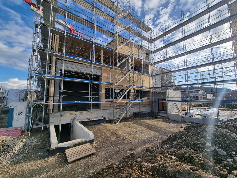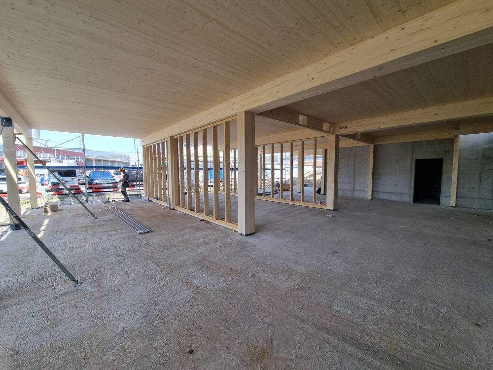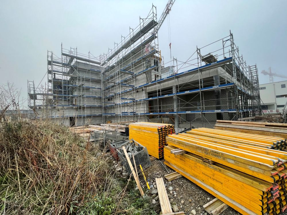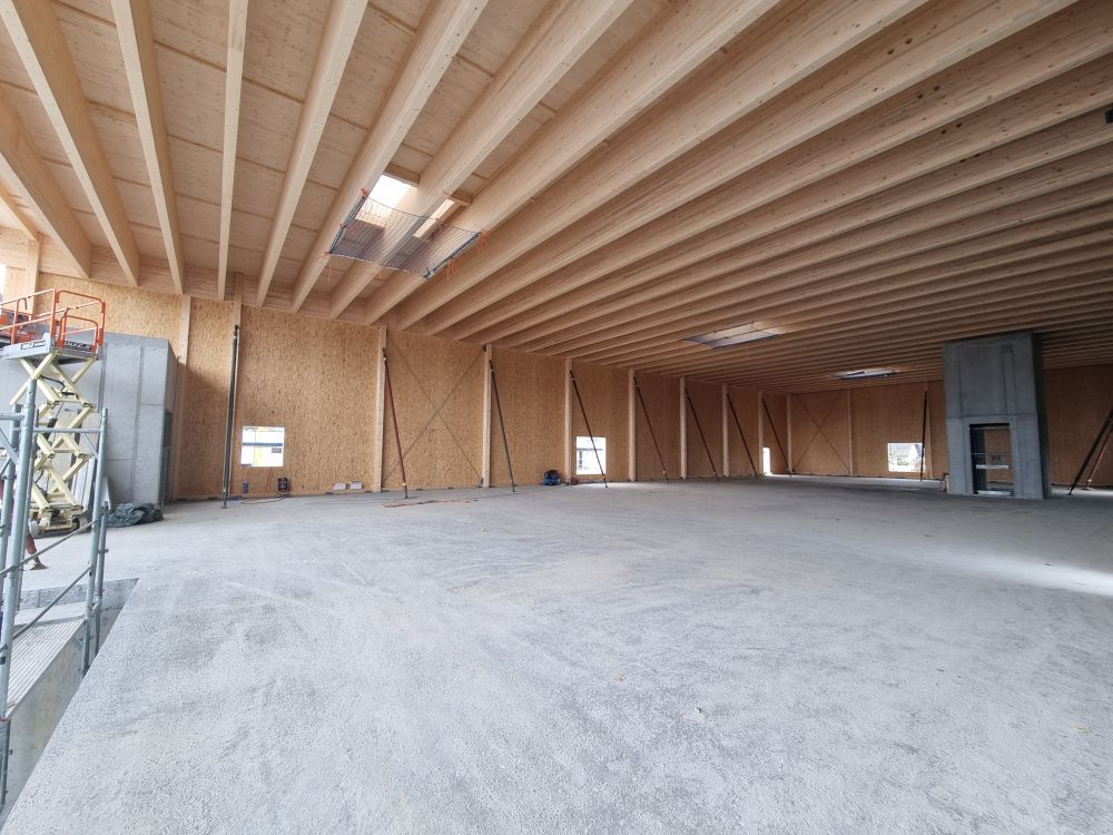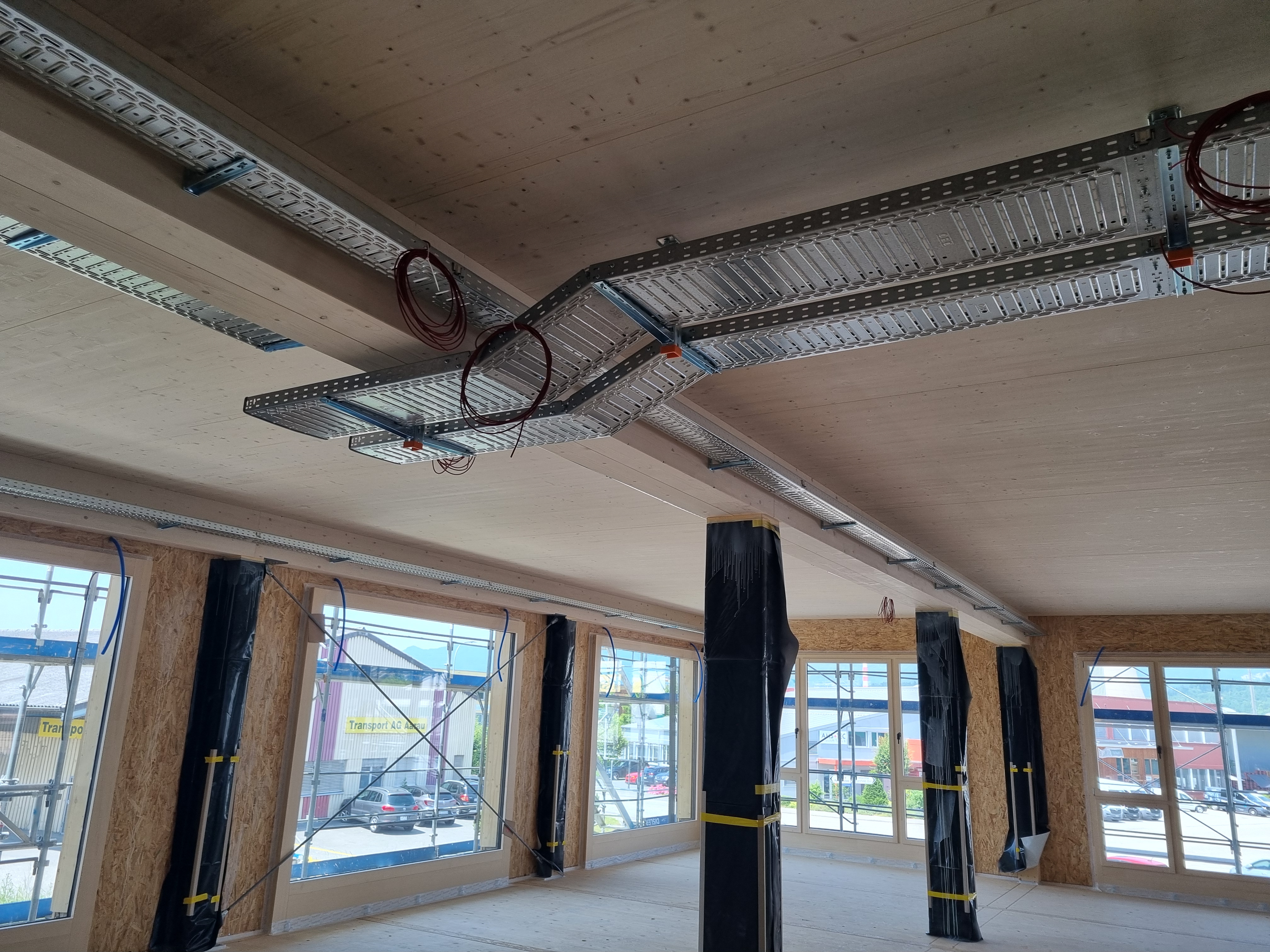 Les travaux sur l'immeuble des bureaux avancent rapidement. La construction en bois est en grande partie terminée, tout comme le toit plat.