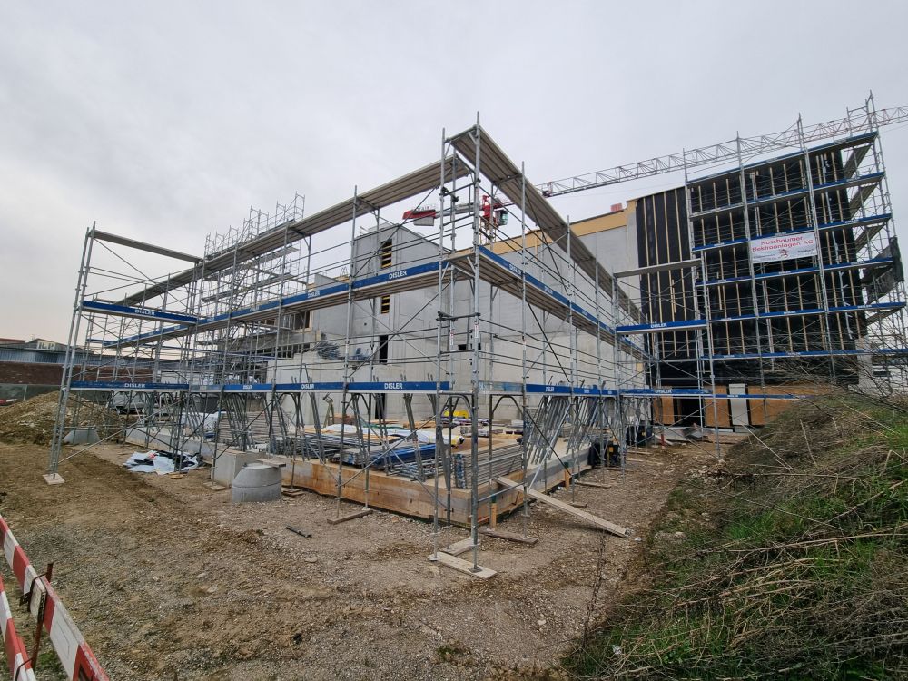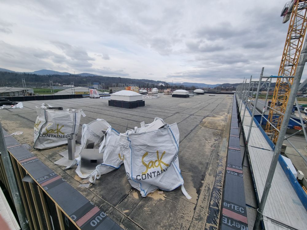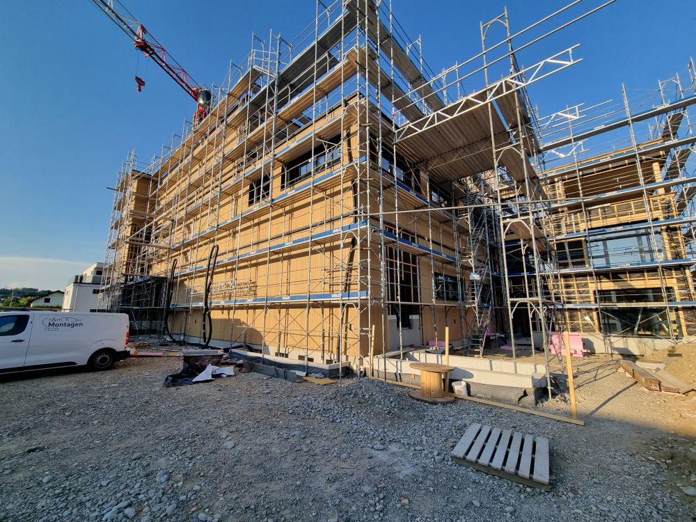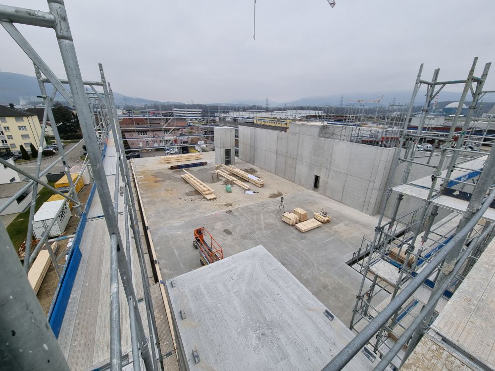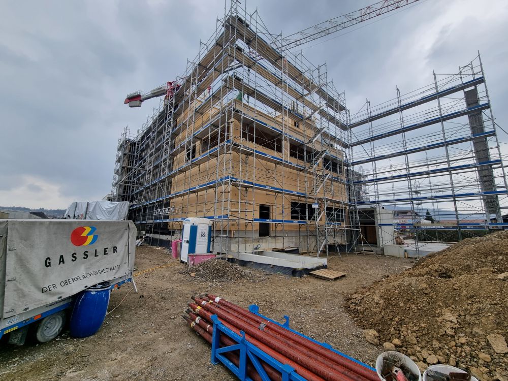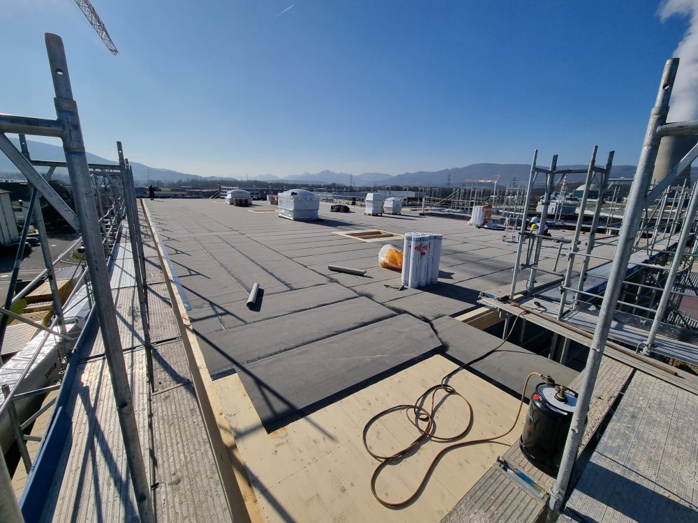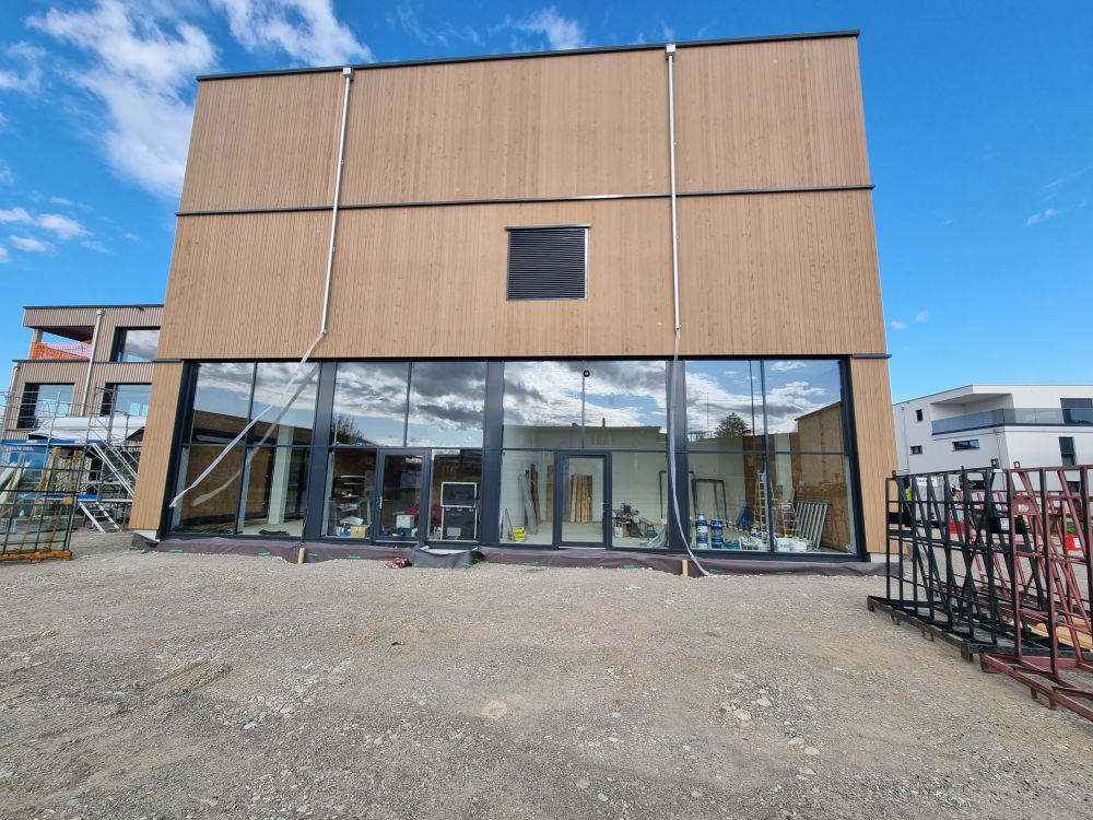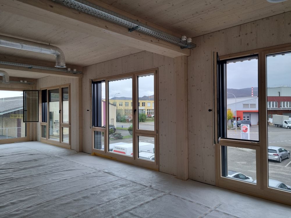 Les travaux sur l'immeuble des bureaux avancent rapidement. La construction en bois est en grande partie terminée, tout comme le toit plat.