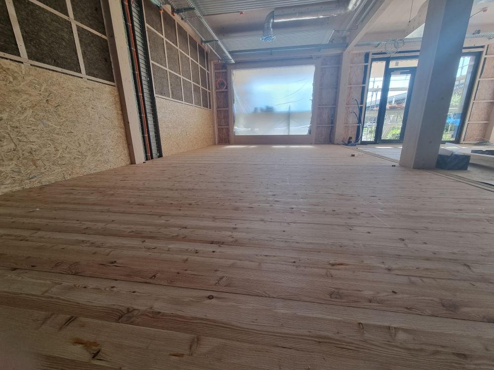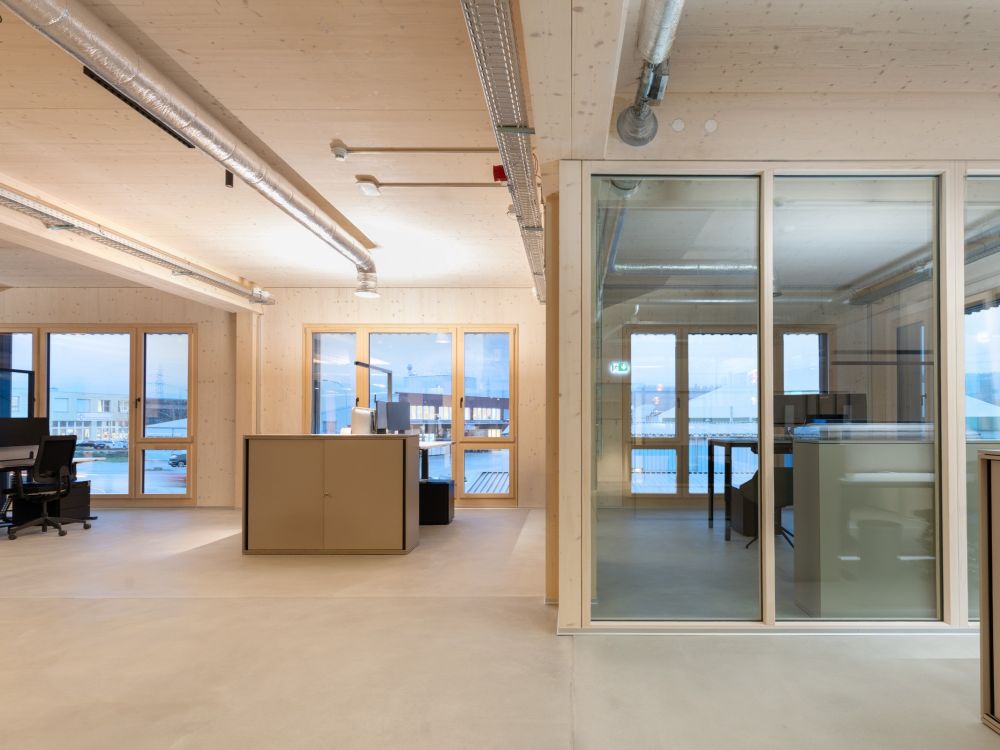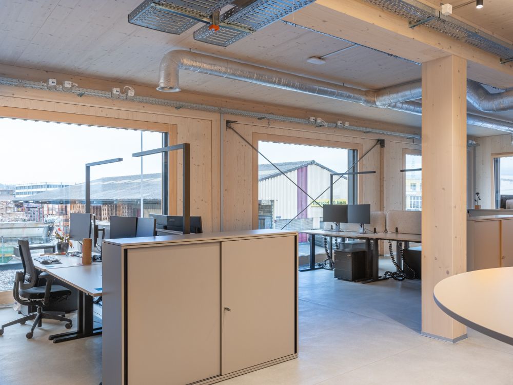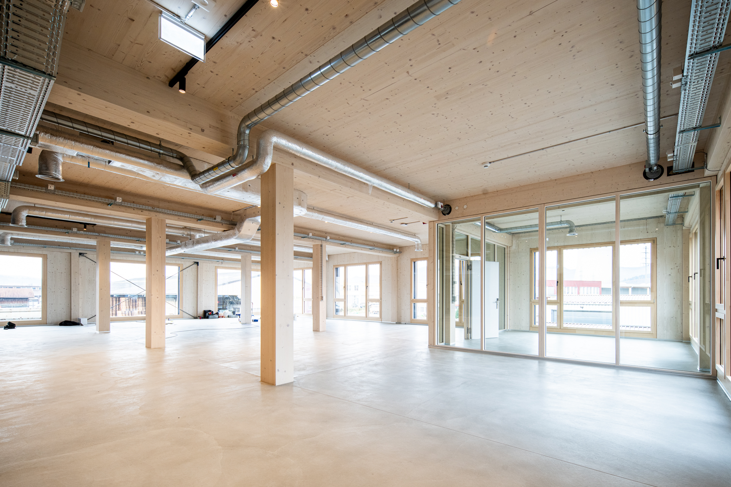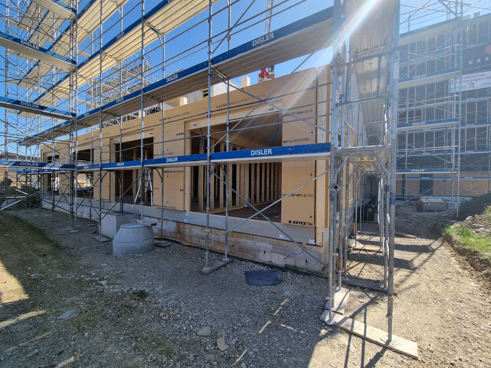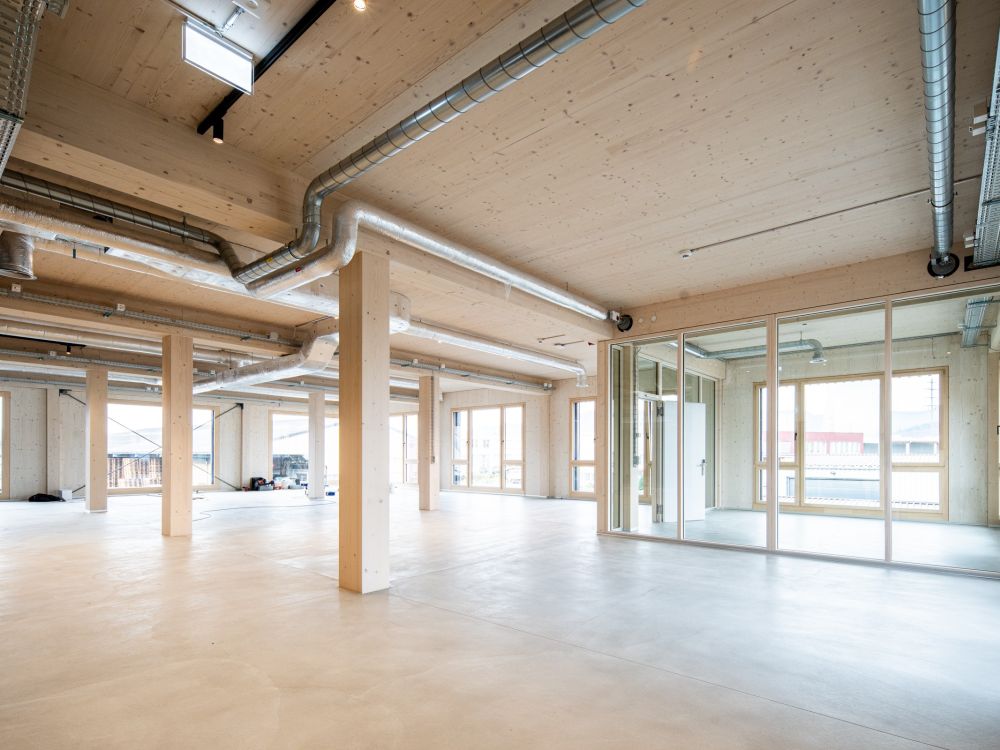 Les travaux sur l'immeuble des bureaux avancent rapidement. La construction en bois est en grande partie terminée, tout comme le toit plat.