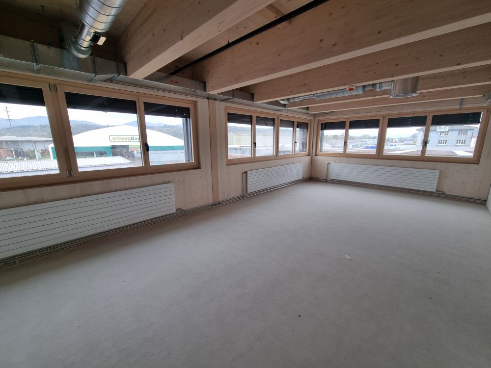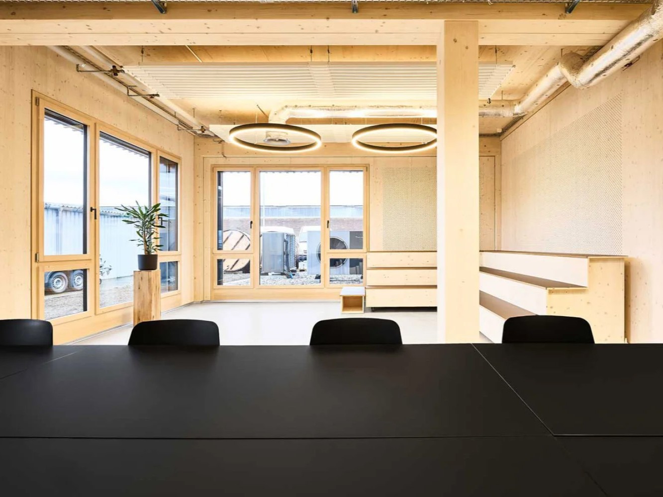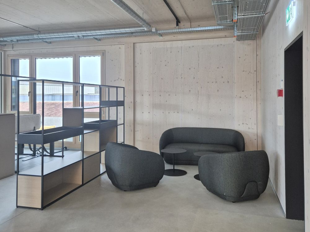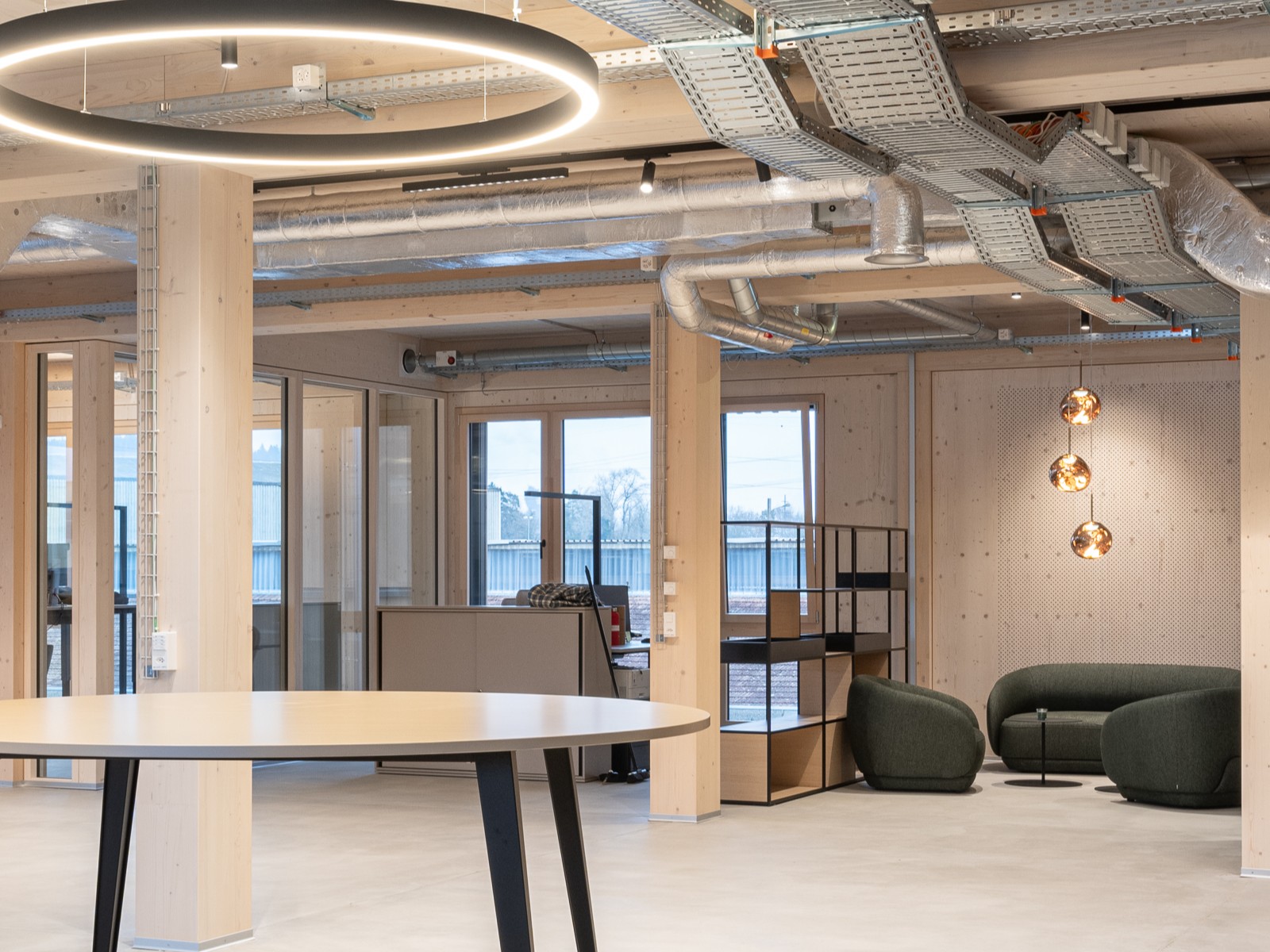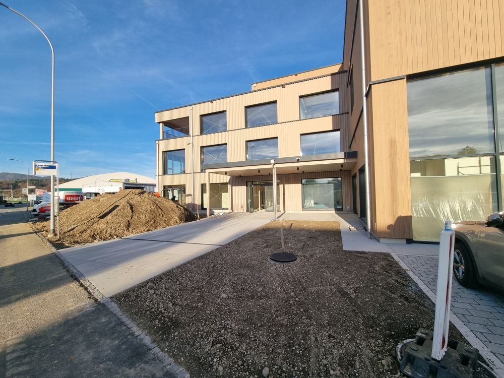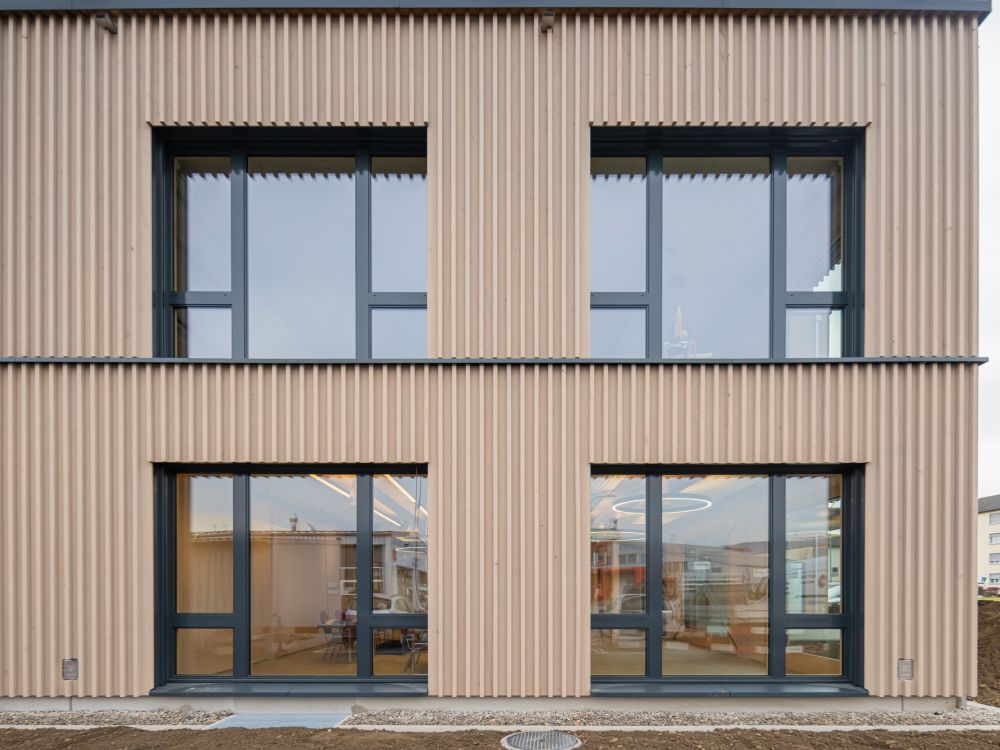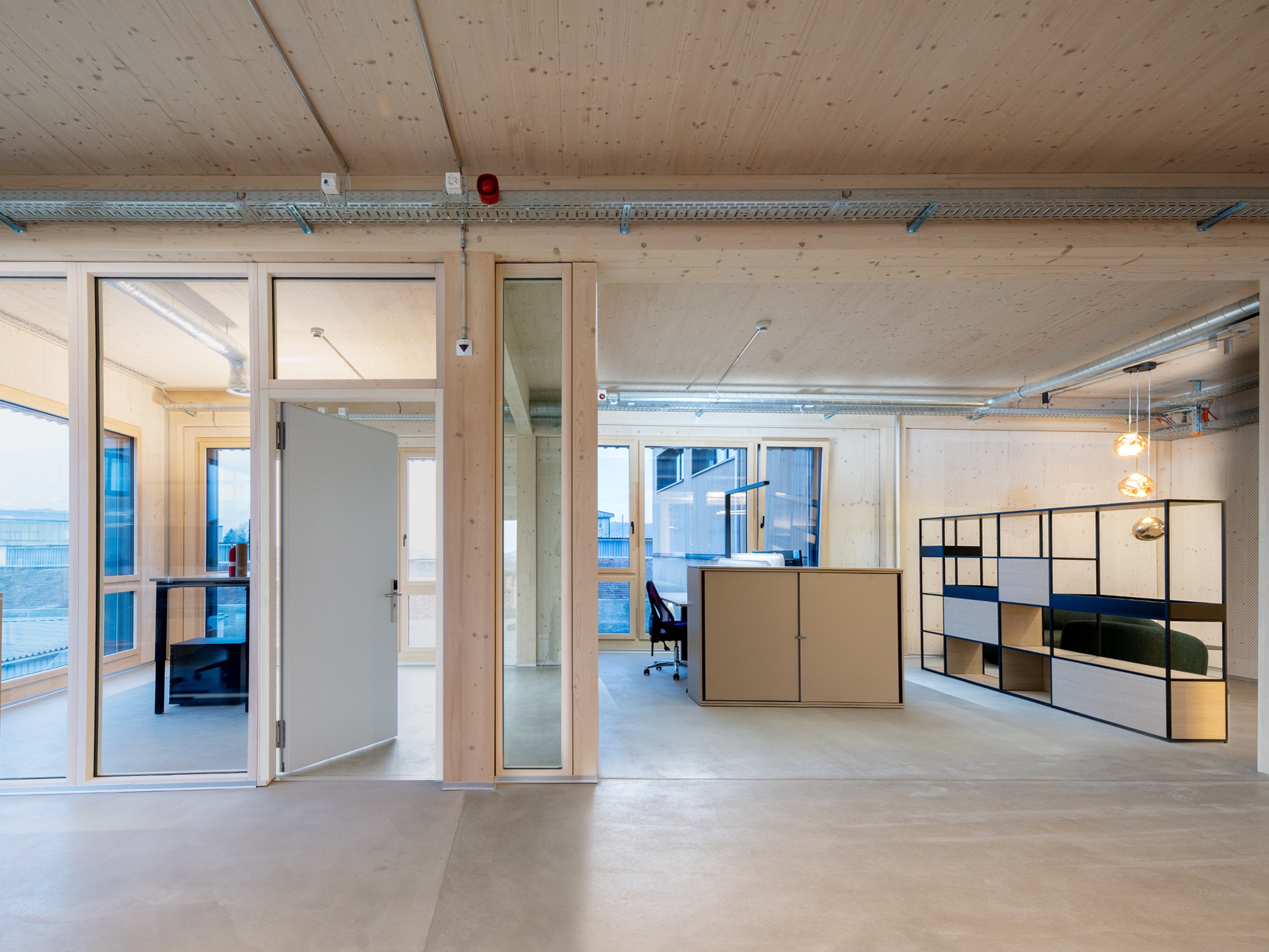 Les travaux sur l'immeuble des bureaux avancent rapidement. La construction en bois est en grande partie terminée, tout comme le toit plat.