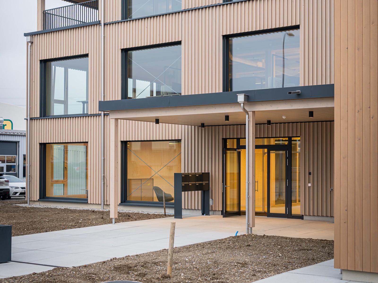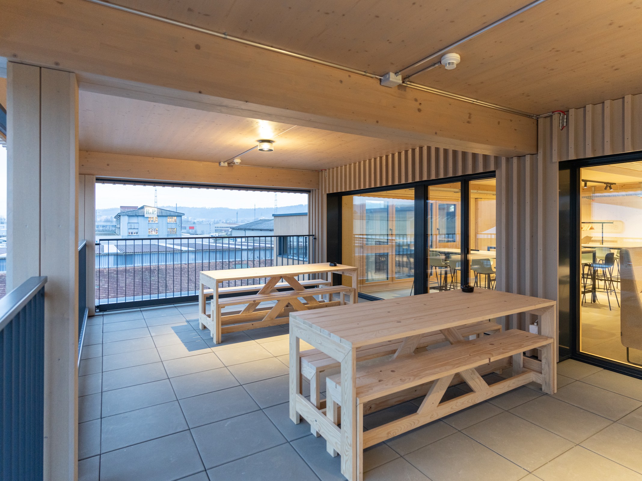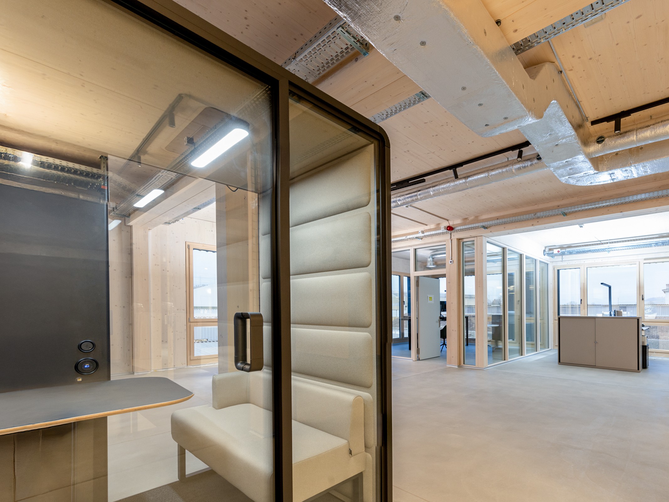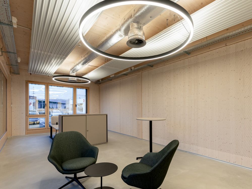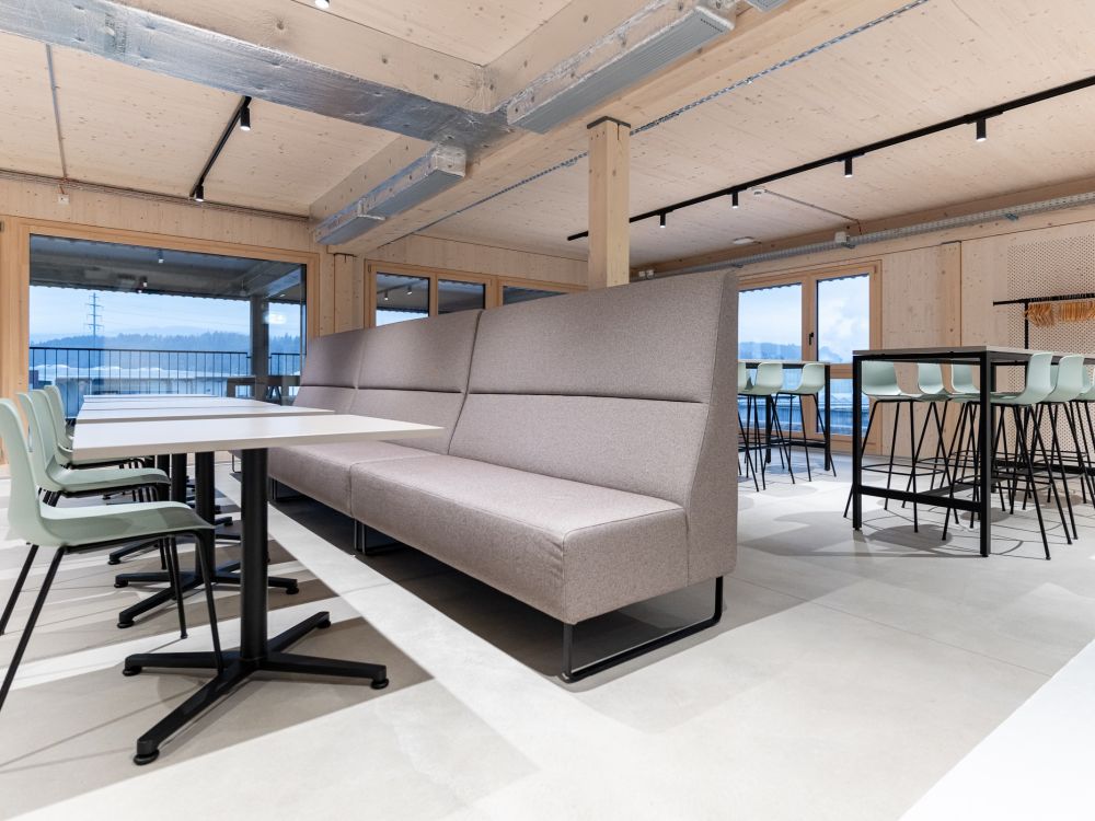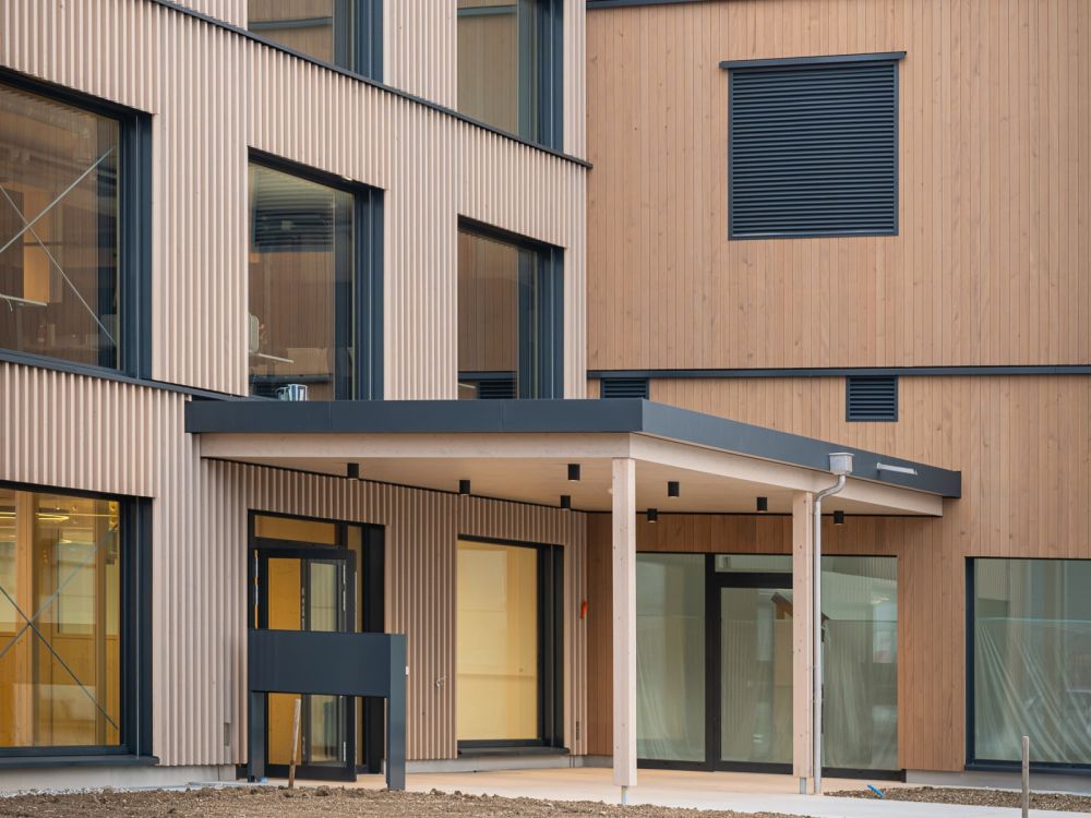 Les travaux sur l'immeuble des bureaux avancent rapidement. La construction en bois est en grande partie terminée, tout comme le toit plat.