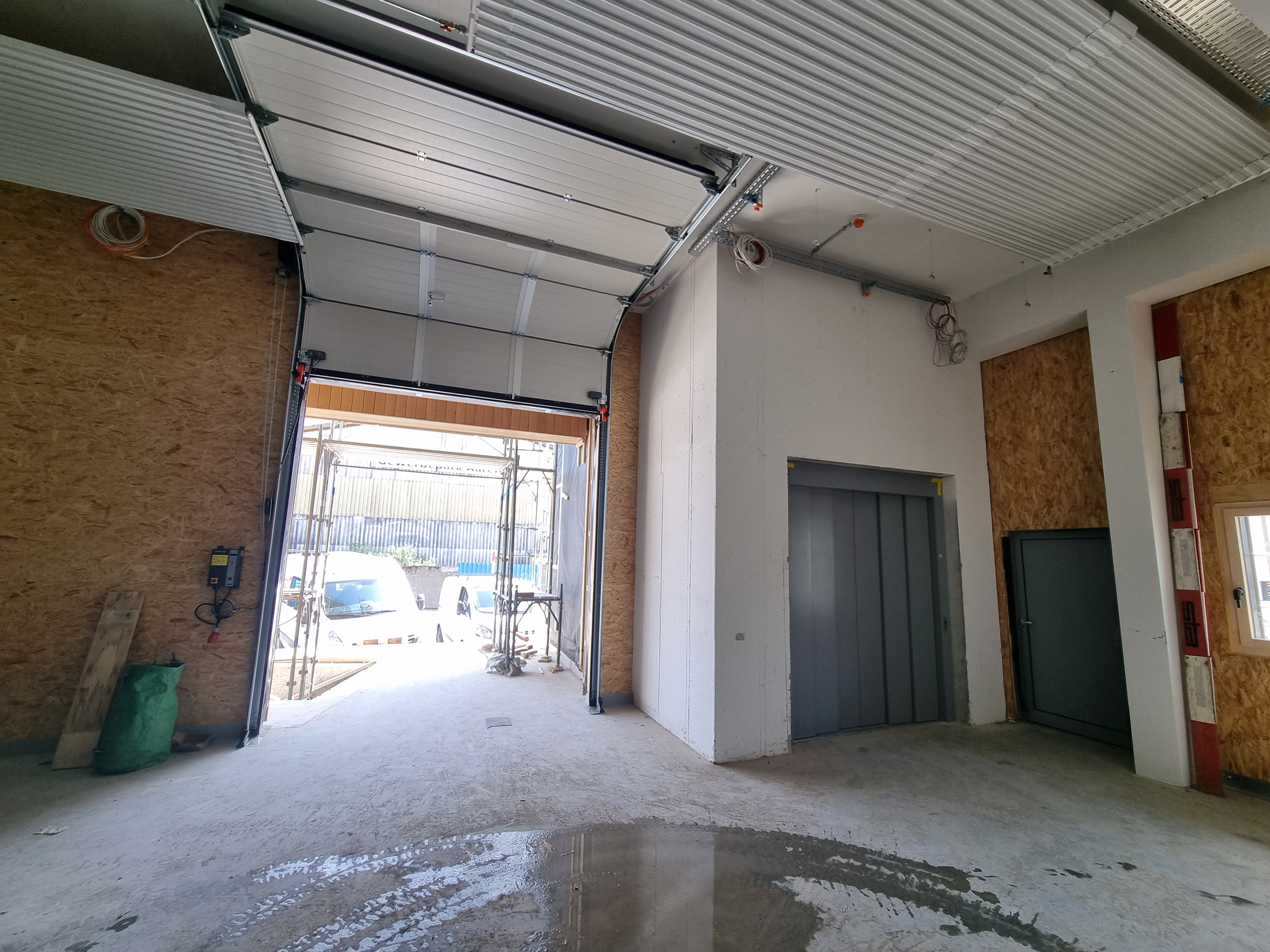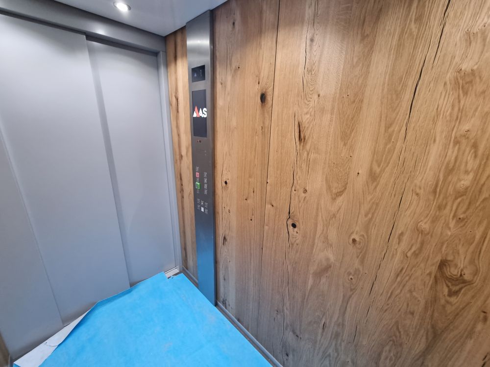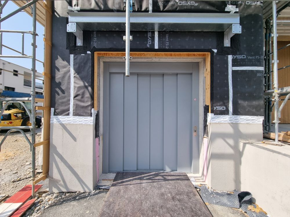 La façade en bois du bâtiment de stockage est pratiquement terminée – elle recevra prochainement sa couche de finition avec notre huile de qualité Renner. Le monte-charge a déjà été installé par les monteurs d’ascenseurs. L’ascenseur pour personnes suivra dans un second temps.