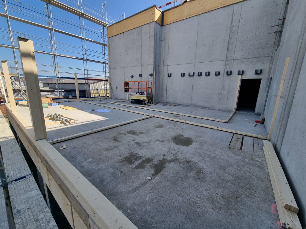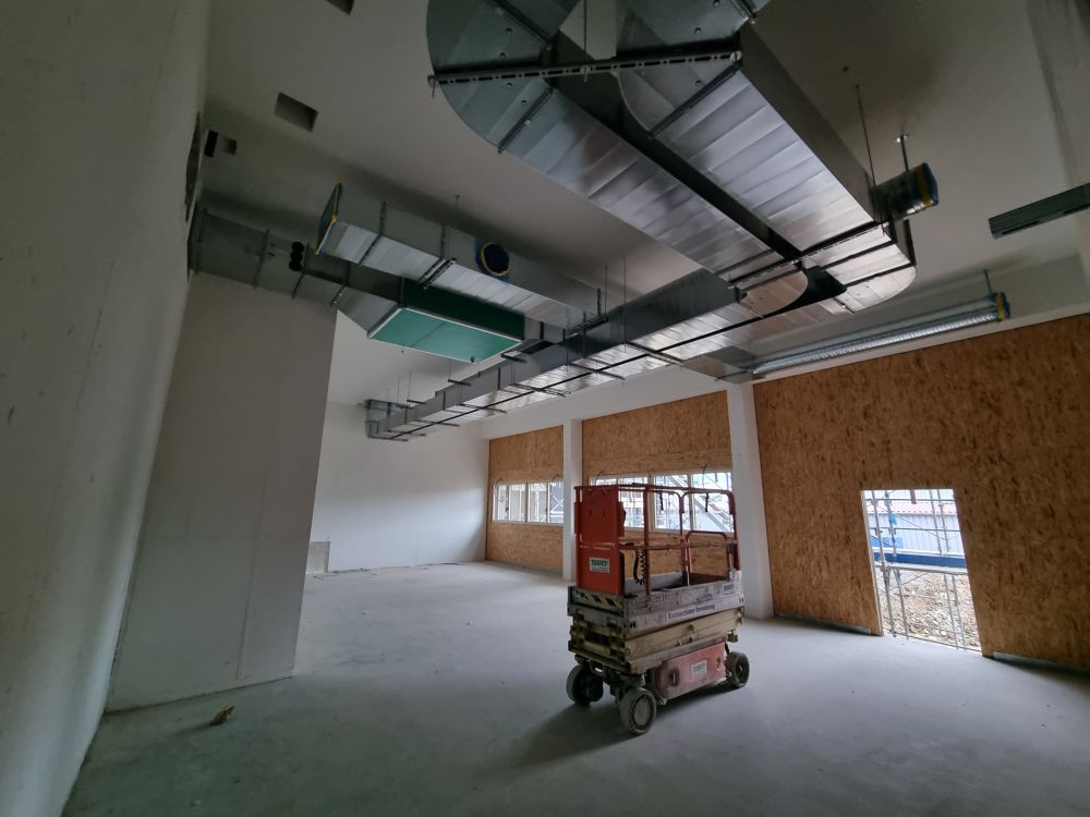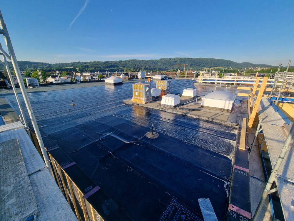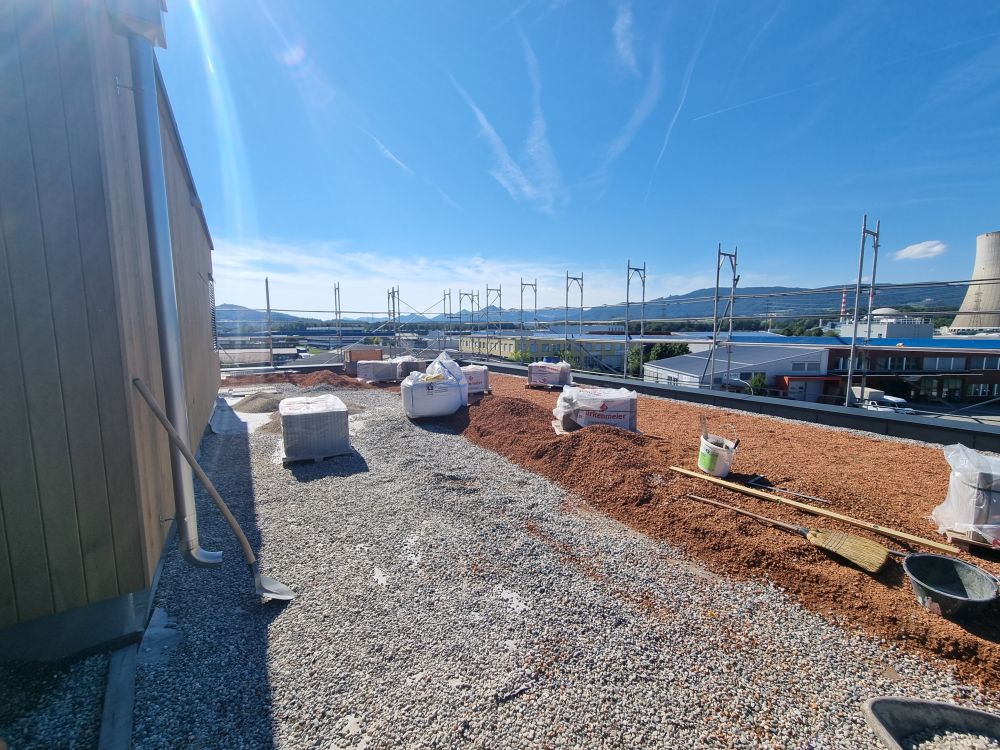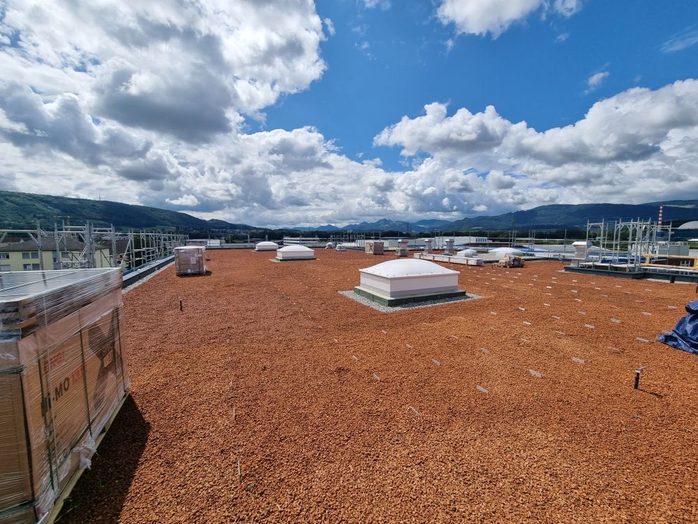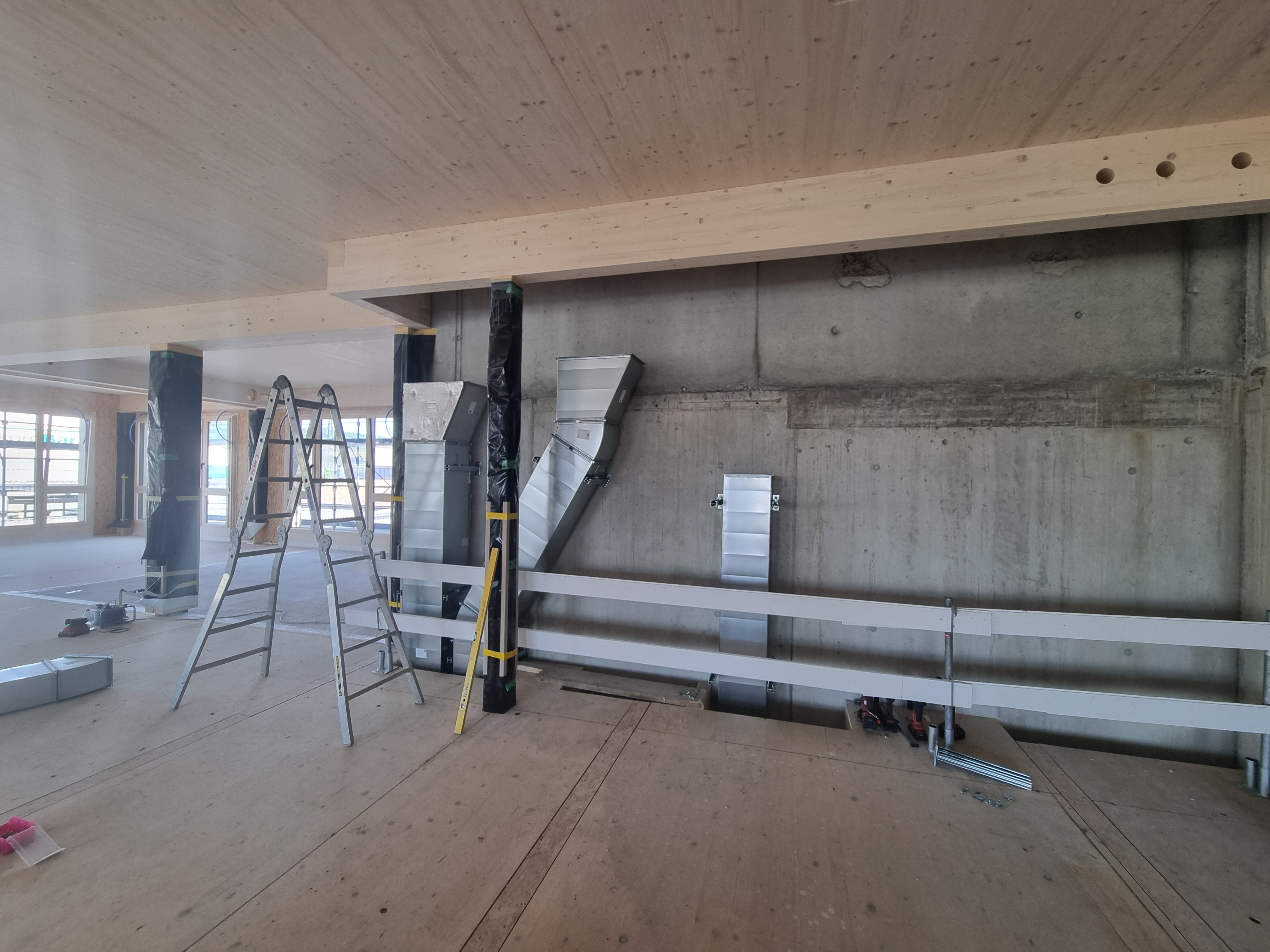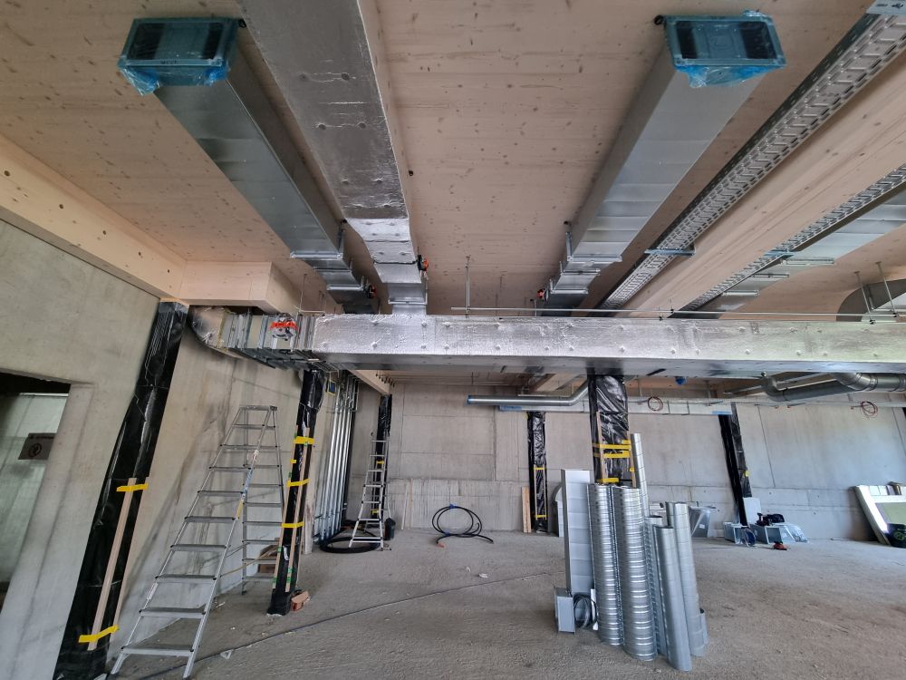 Sur le toit aussi, les choses avancent : l’entreprise de ventilation a posé les lourds équipements techniques et procède actuellement au raccordement des conduits. Les travaux de sanitaire et les installations électriques progressent à bon rythme. Avant les vacances d’été, les chapes seront encore mises en place.