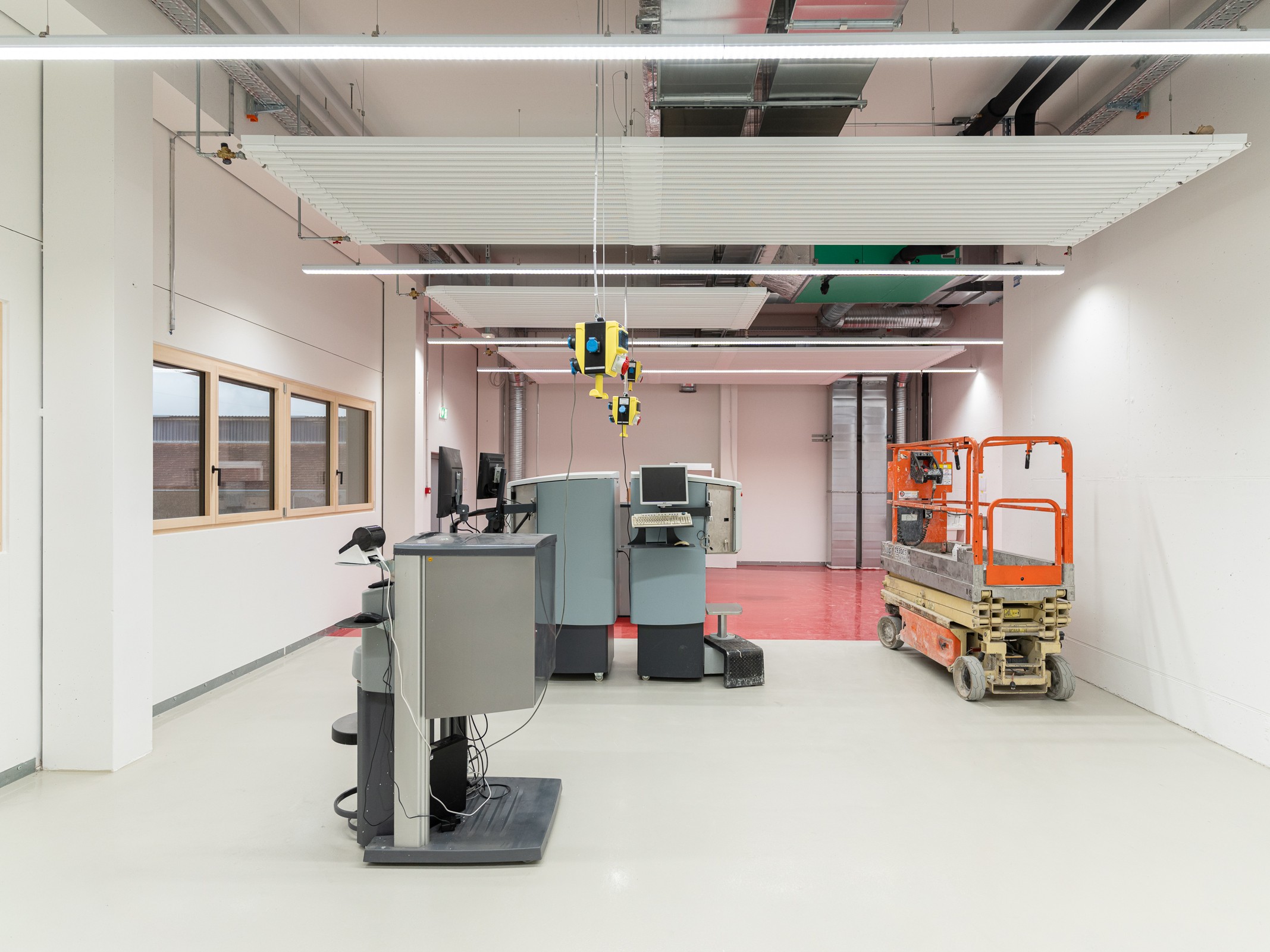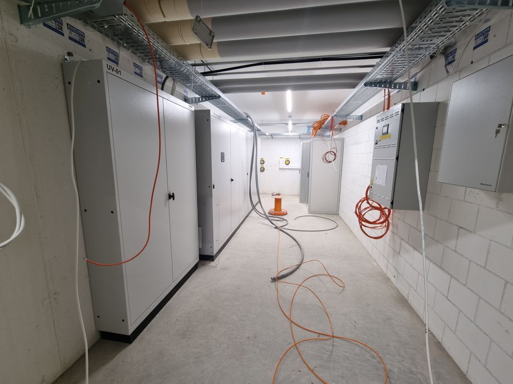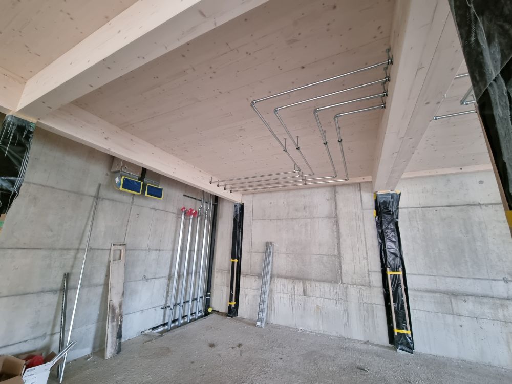 Au sous-sol, les luminaires ont été installés. Les électriciens sont actuellement à pied d’œuvre pour poser plusieurs centaines de mètres de câbles destinés aux capteurs, aux connexions réseau et à d’autres systèmes. Étant donné que toutes les installations restent visibles dans le bâtiment, une exécution particulièrement soignée est requise, notamment pour des raisons esthétiques.