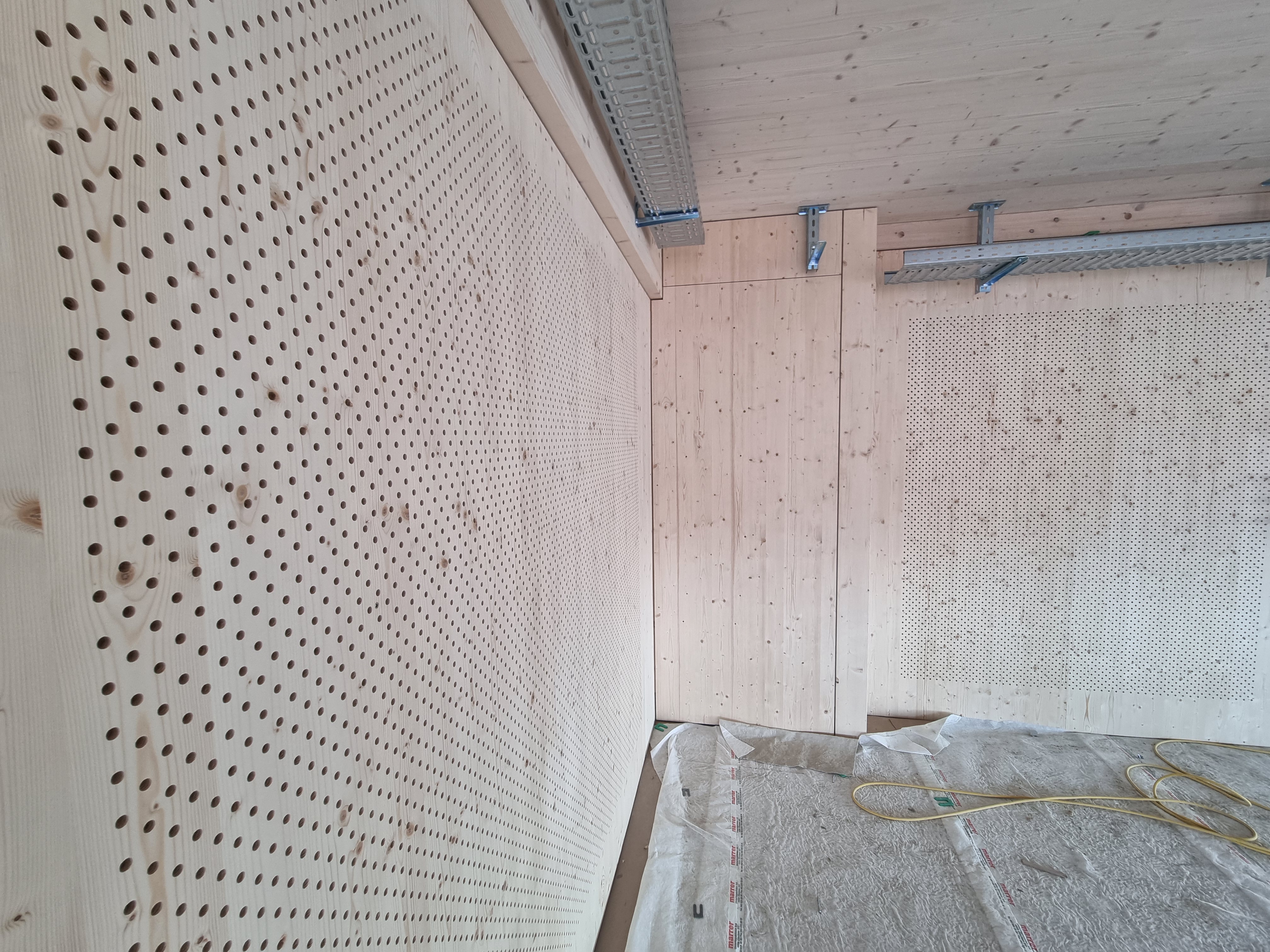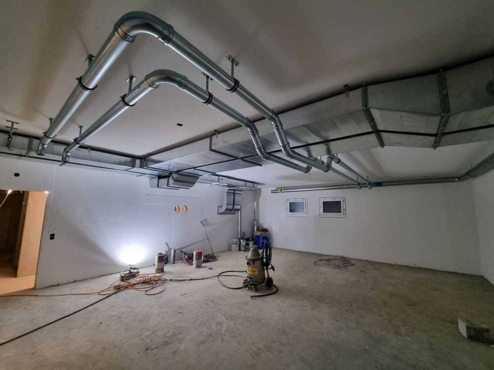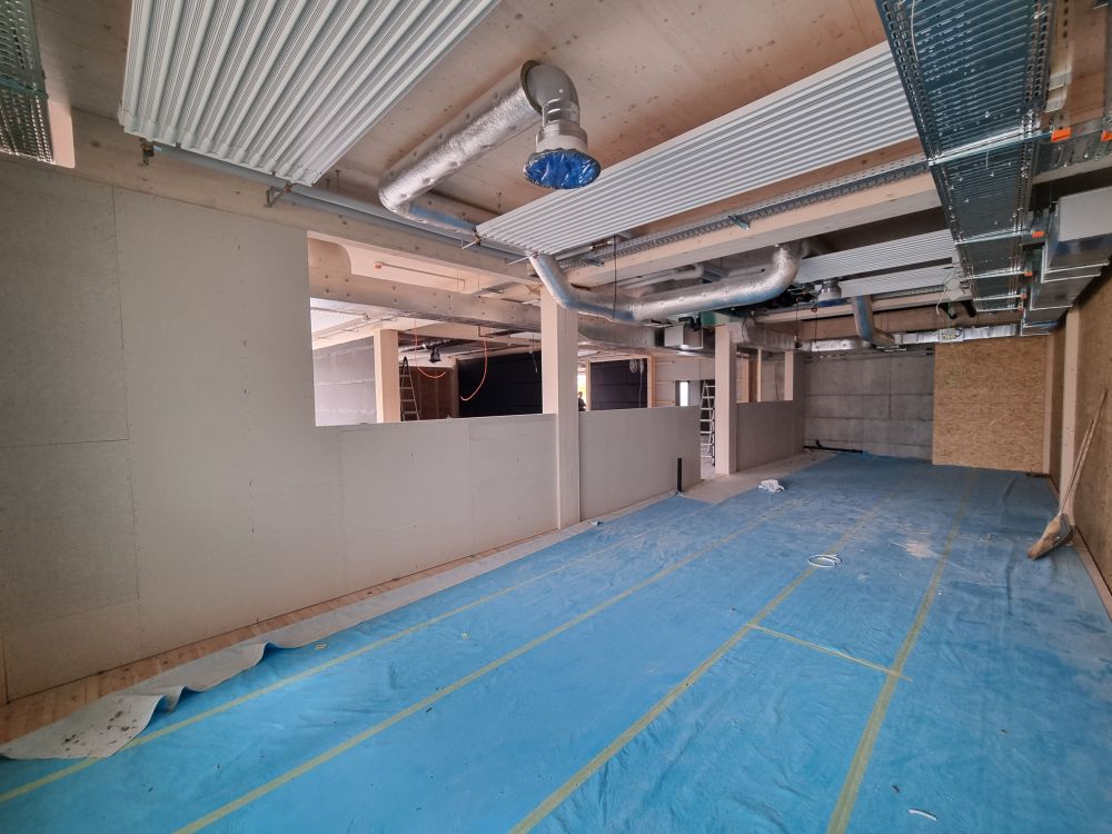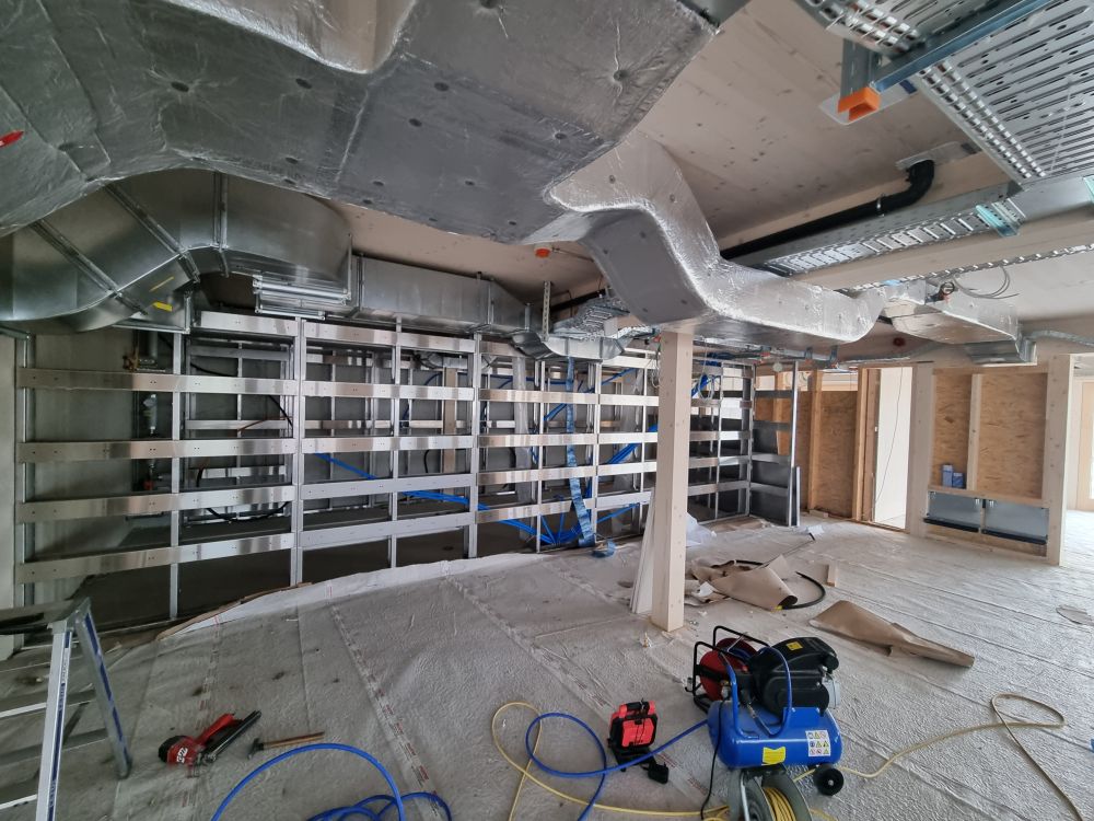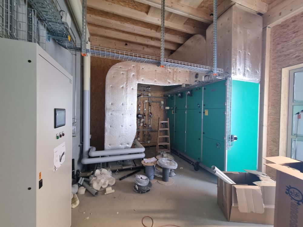 Actuellement, les locaux techniques sont construits en bois et, parallèlement, les installations des systèmes de ventilation sont en cours dans tout le bâtiment.