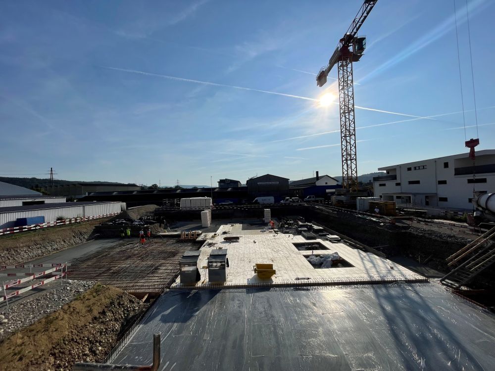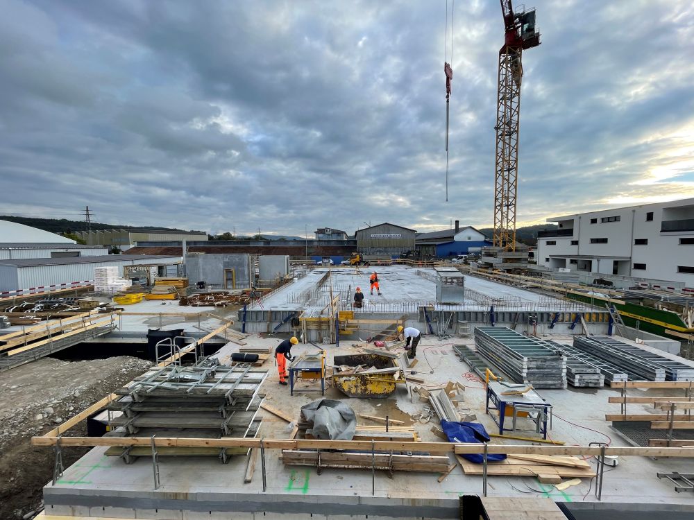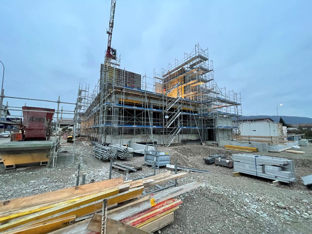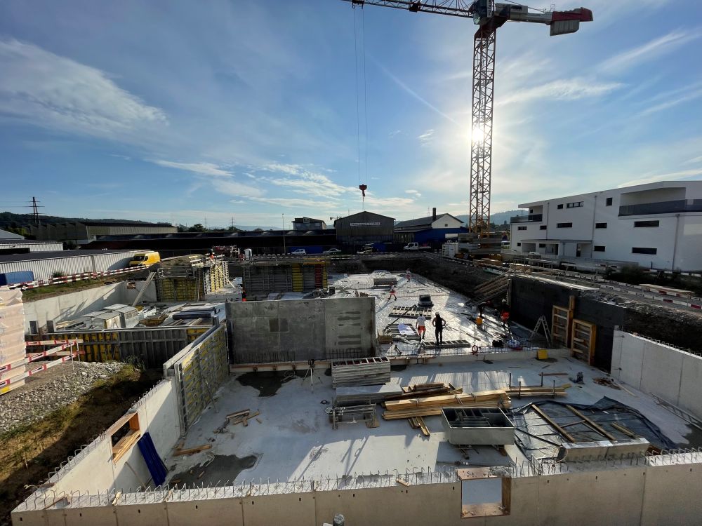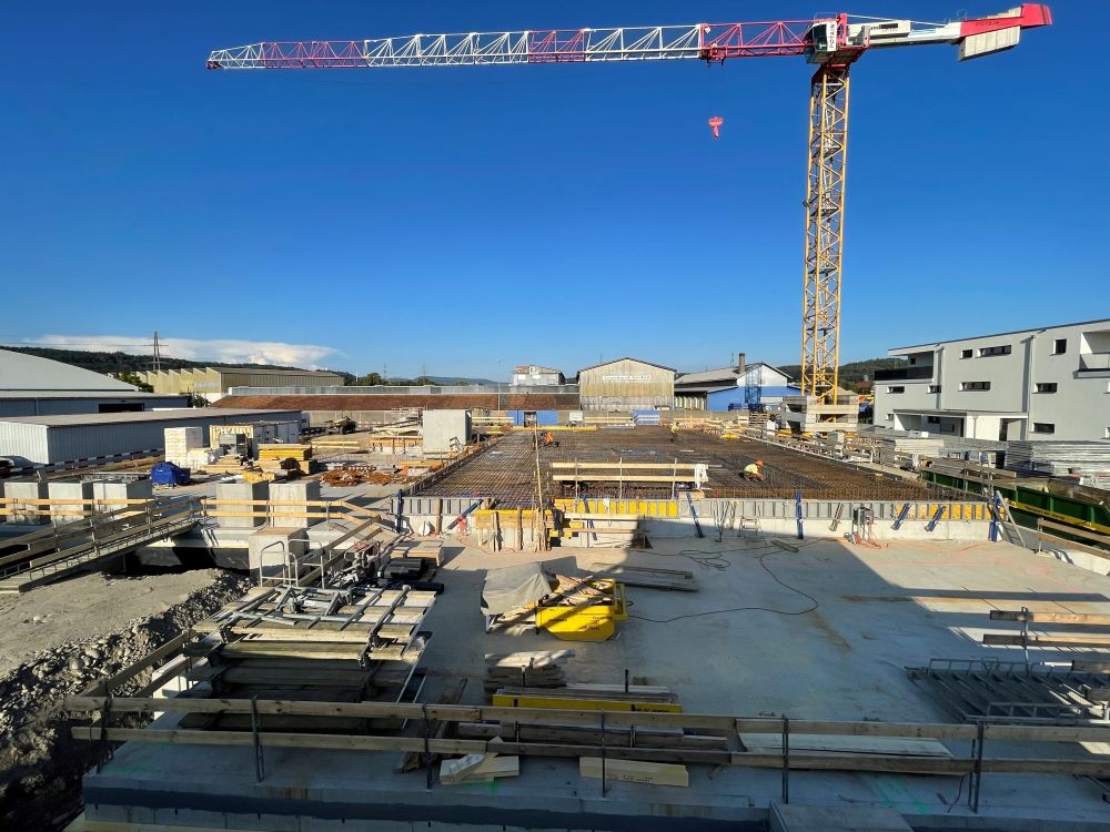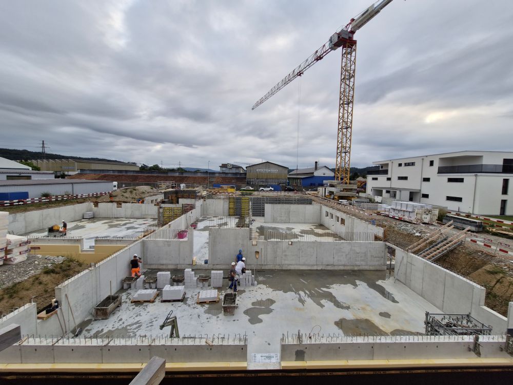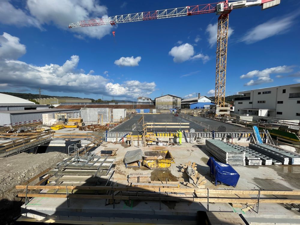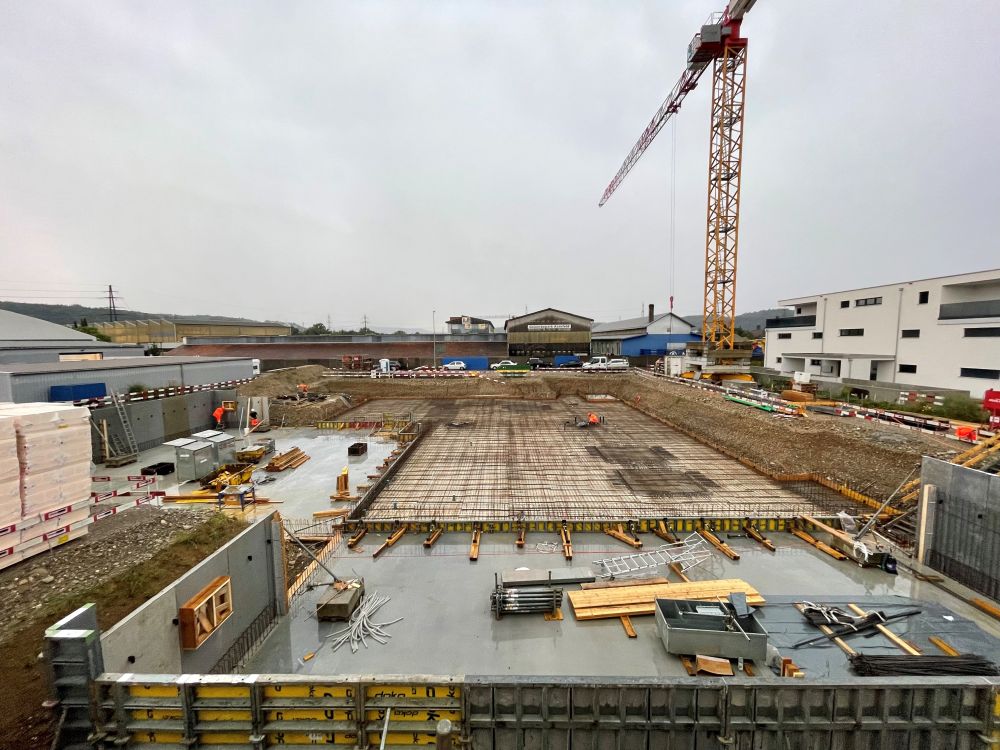 Avec l'achèvement du bétonnage de la dalle, nous entrons à présent dans la phase de gros œuvre de notre projet de nouvelle construction. Cette phase comprend la mise en place des structures porteuses et marquera une avancée significative sur le chantier.