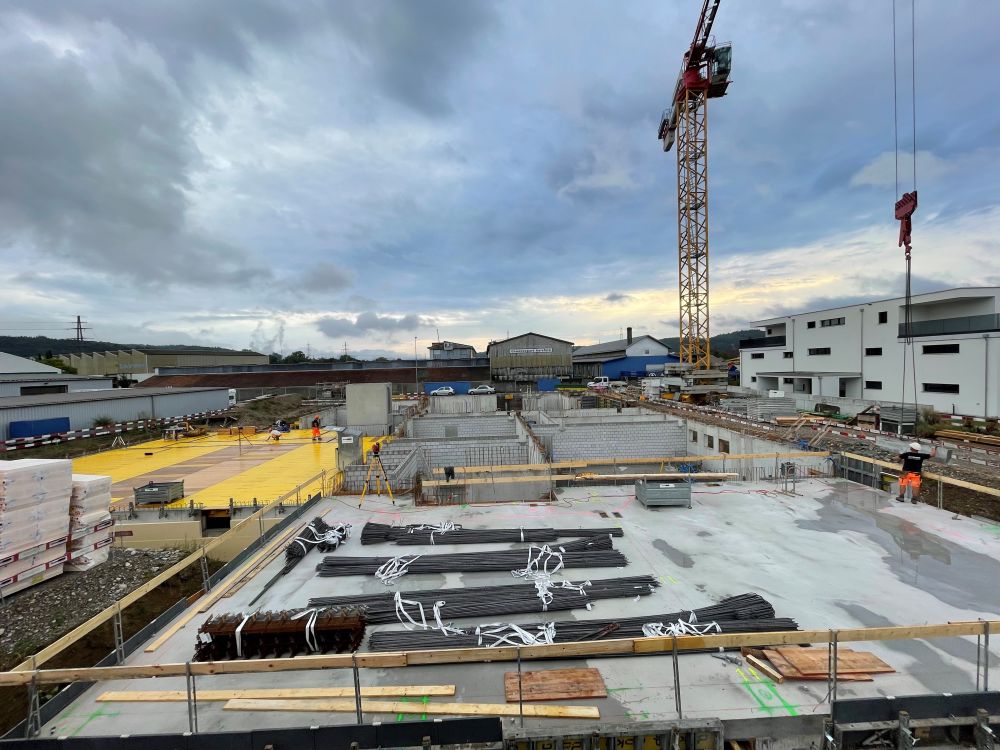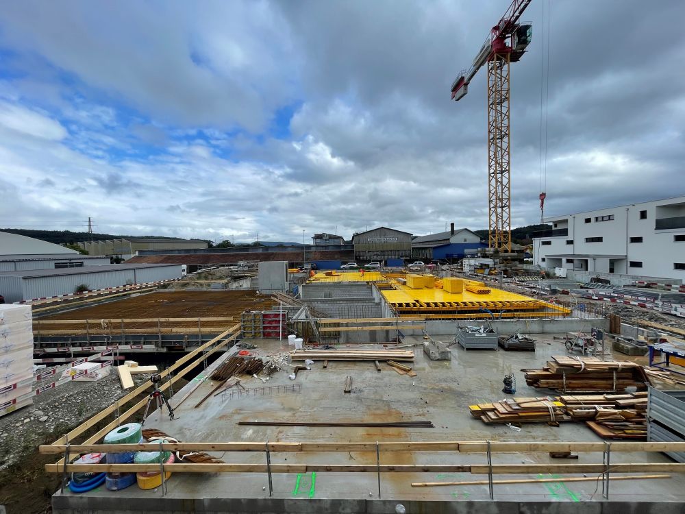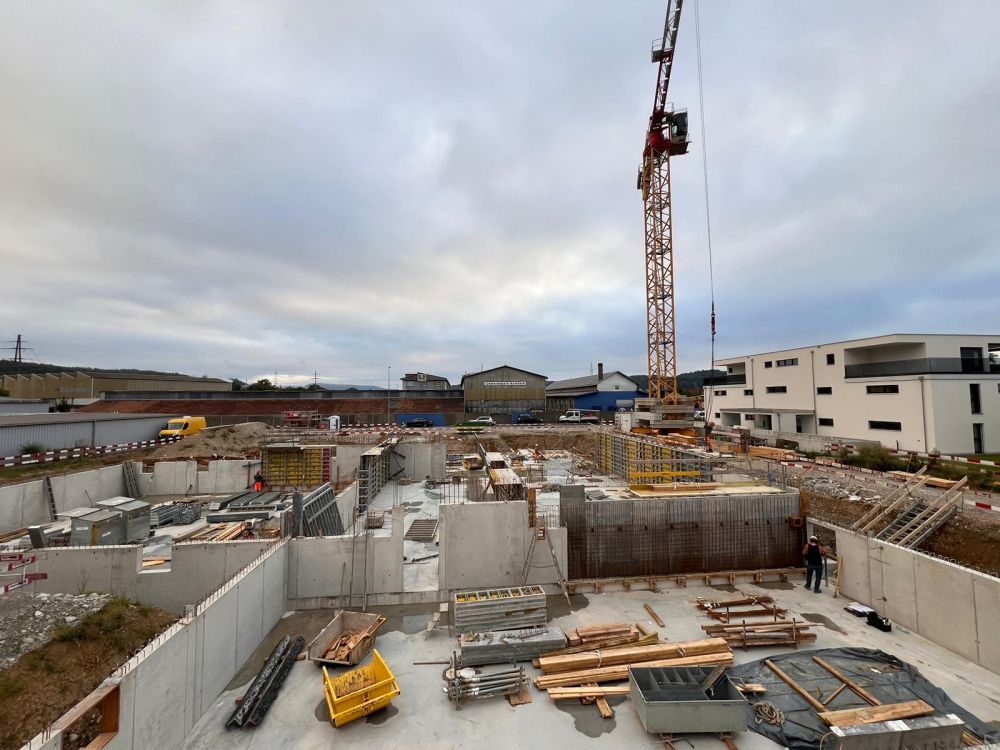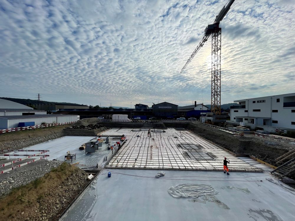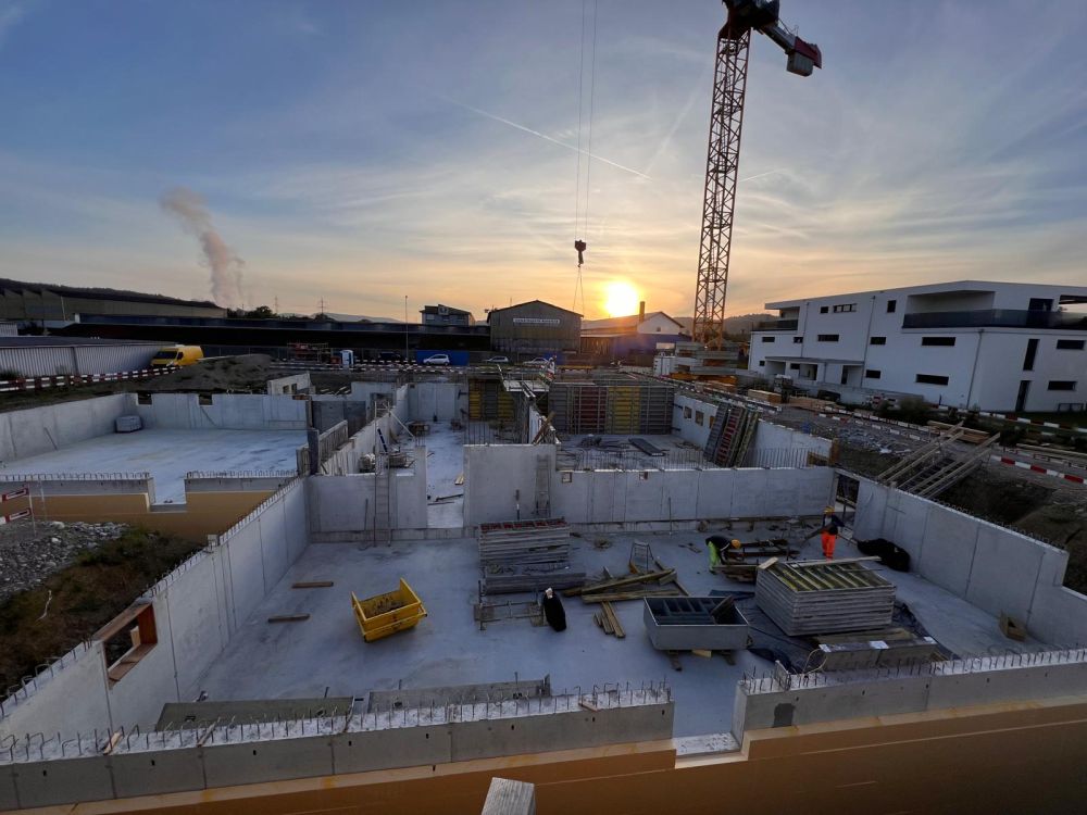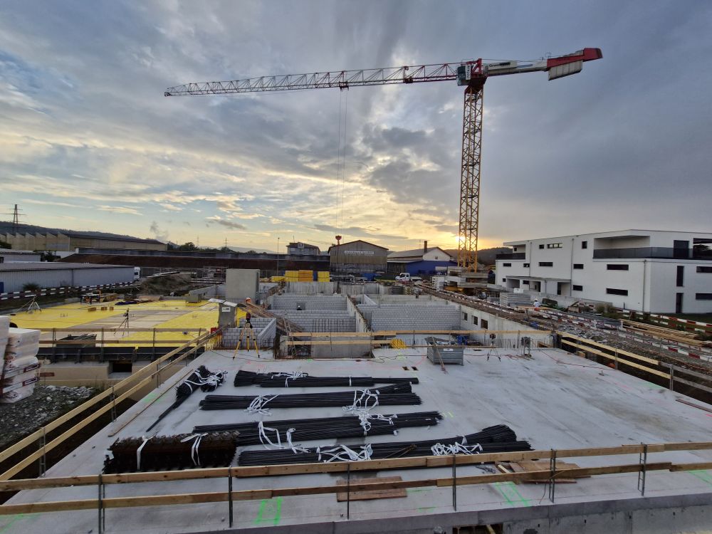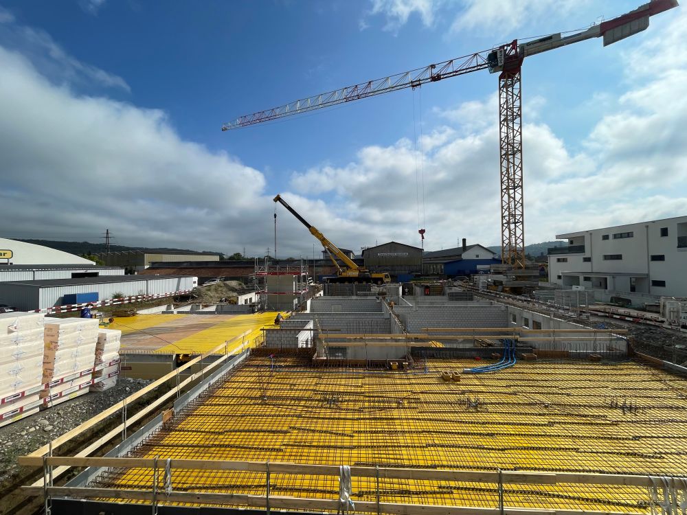 Avec l'achèvement du bétonnage de la dalle, nous entrons à présent dans la phase de gros œuvre de notre projet de nouvelle construction. Cette phase comprend la mise en place des structures porteuses et marquera une avancée significative sur le chantier.