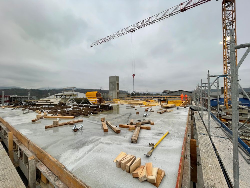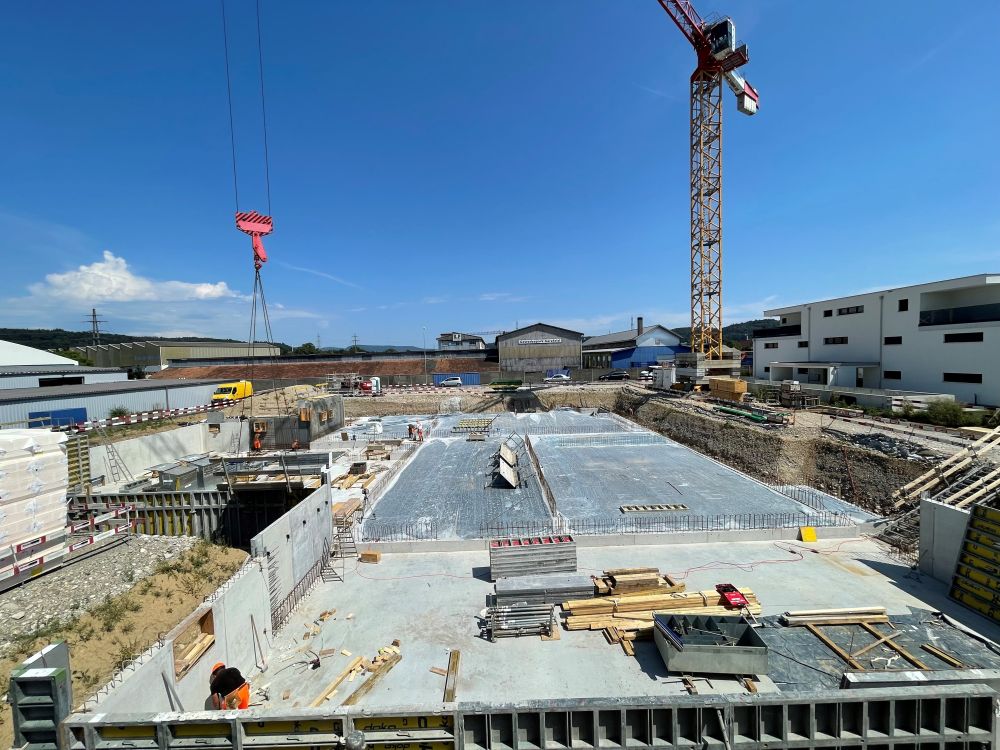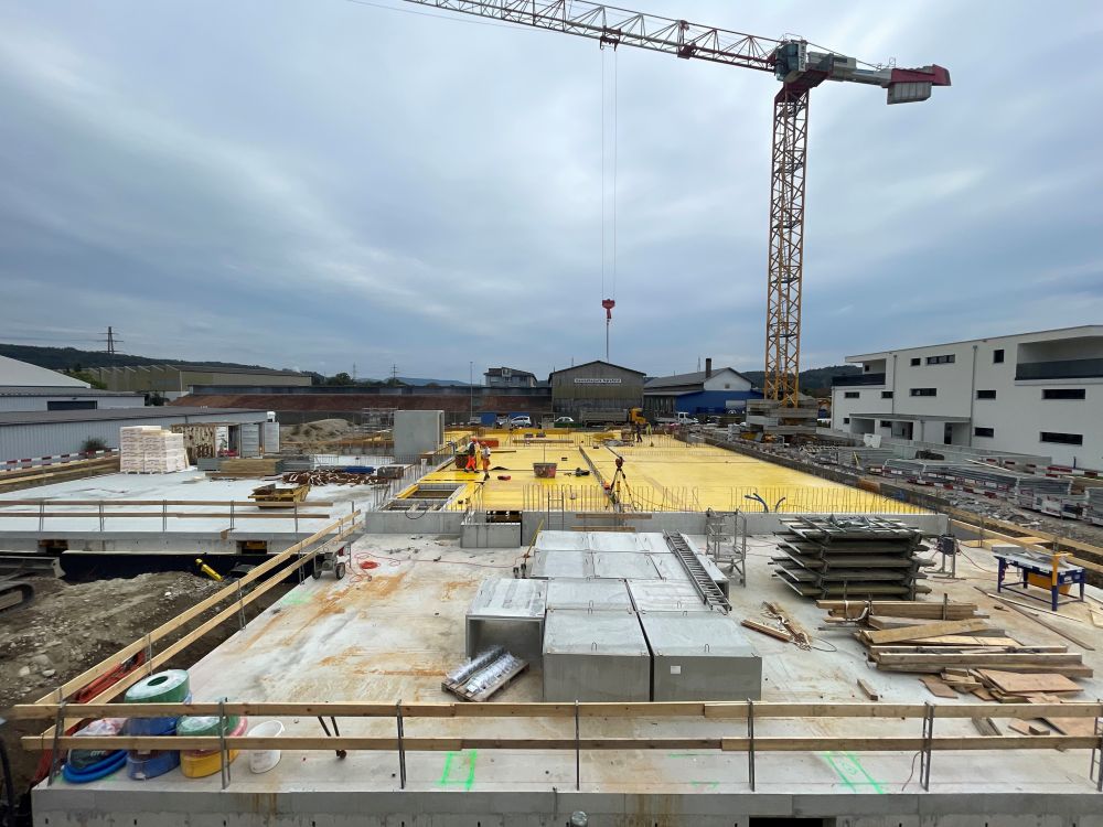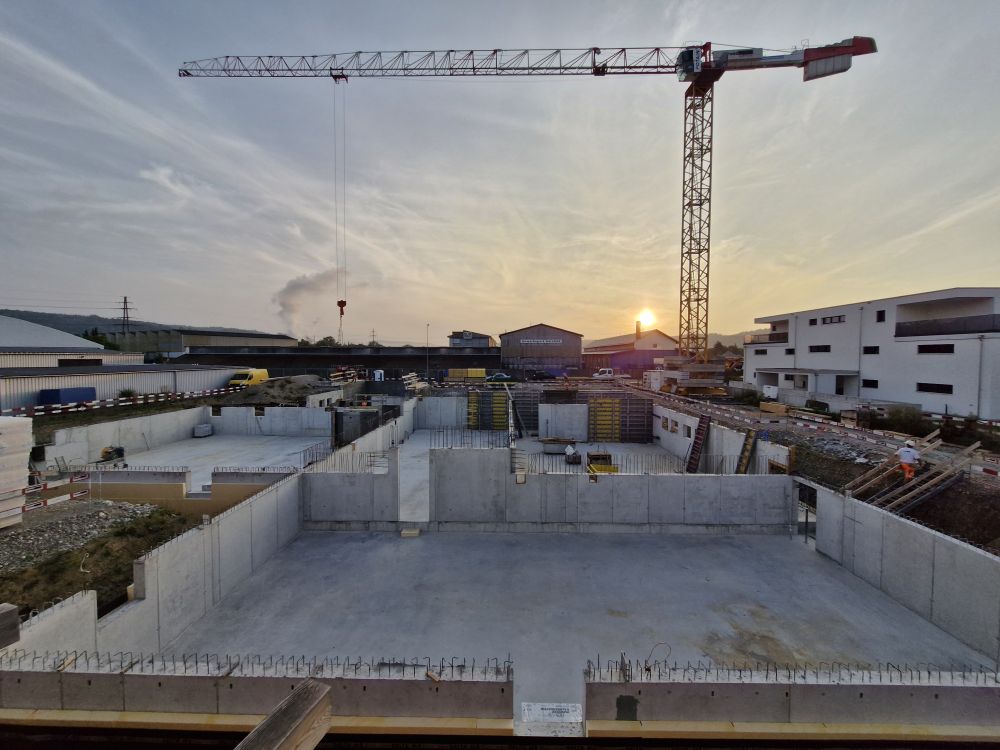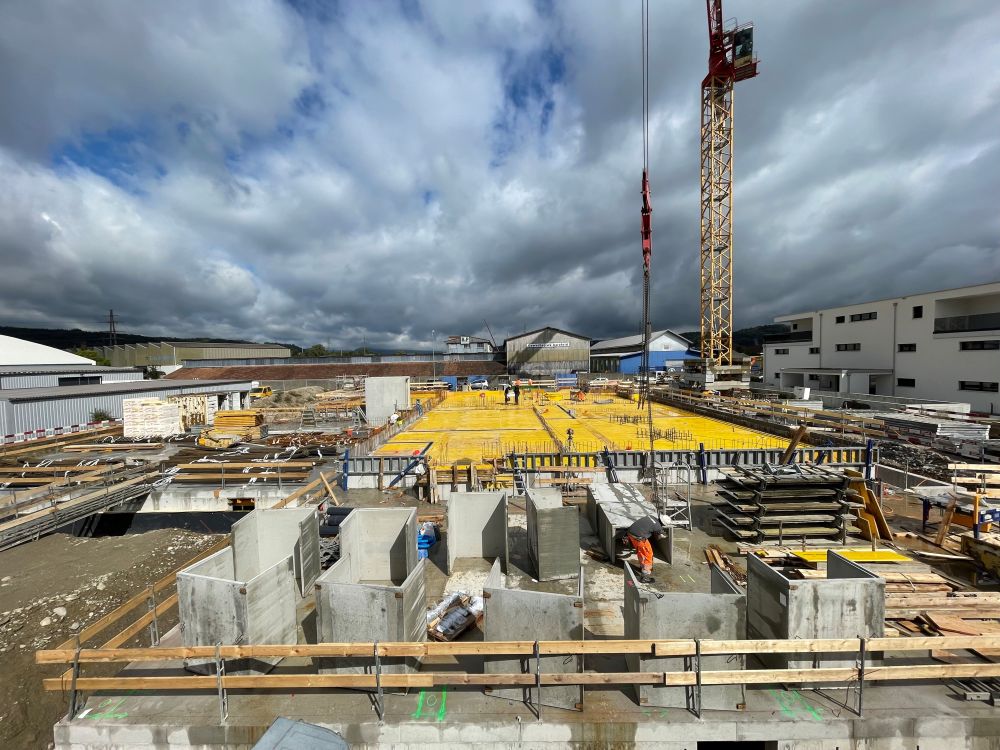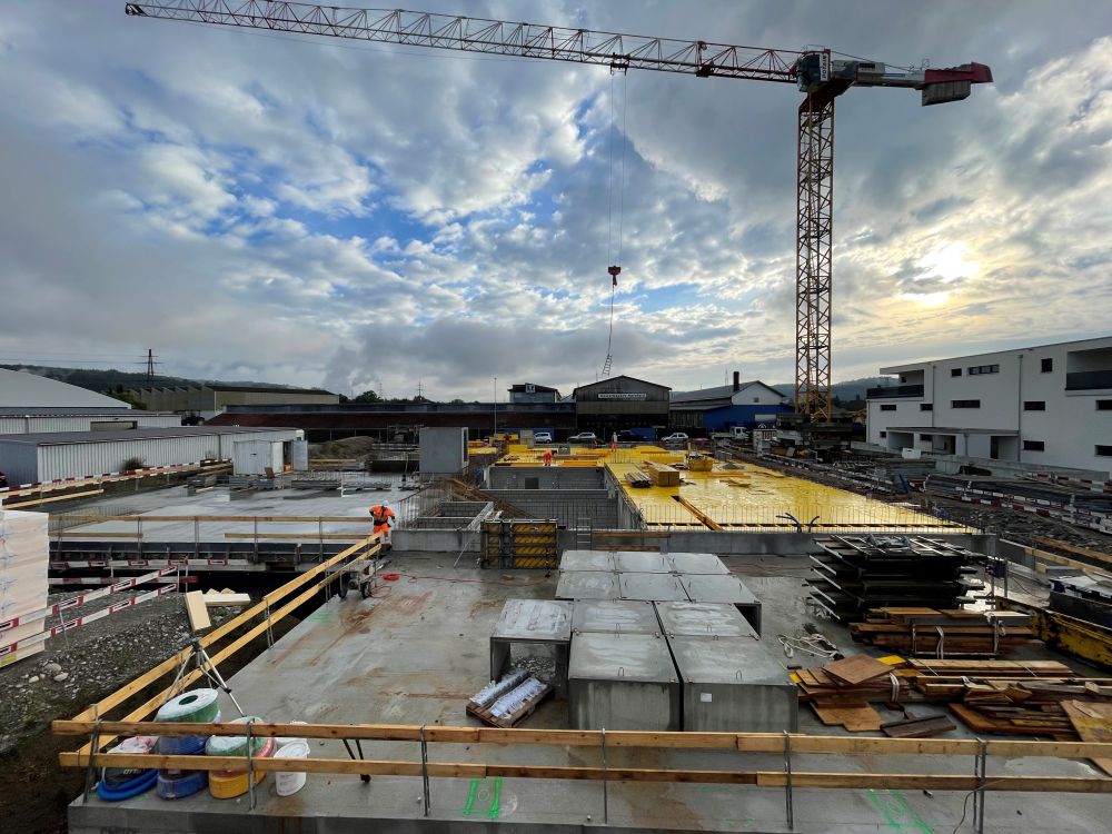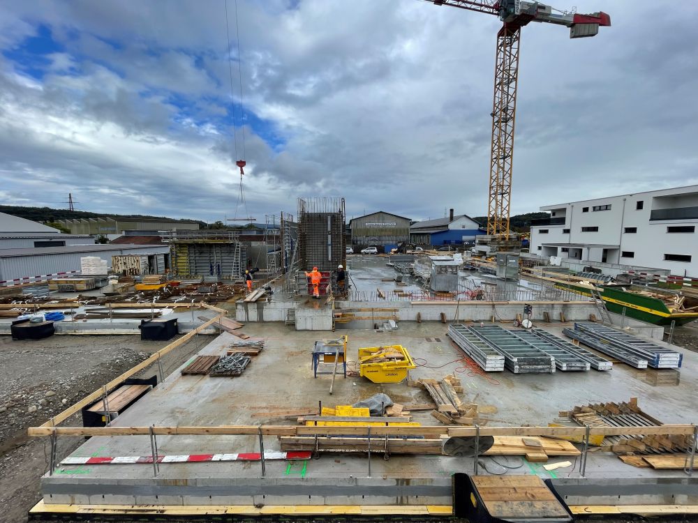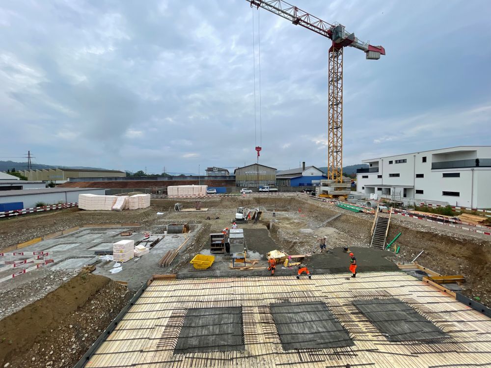 Avec l'achèvement du bétonnage de la dalle, nous entrons à présent dans la phase de gros œuvre de notre projet de nouvelle construction. Cette phase comprend la mise en place des structures porteuses et marquera une avancée significative sur le chantier.