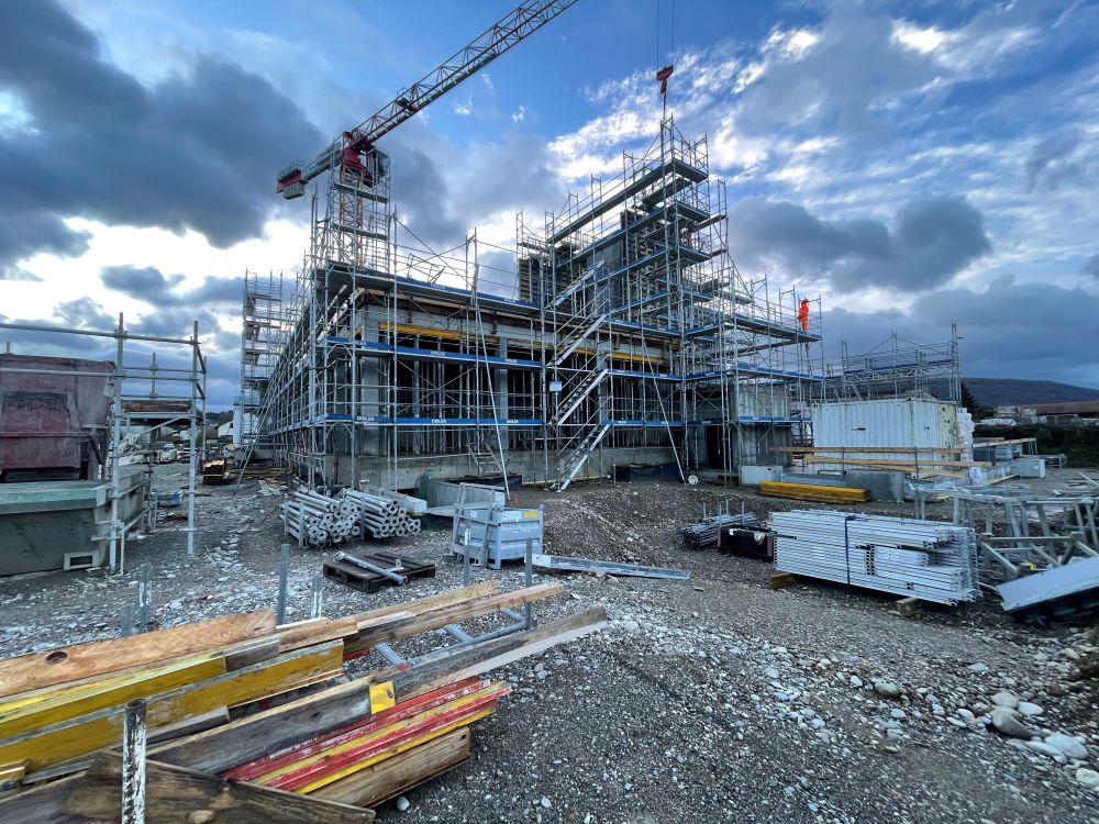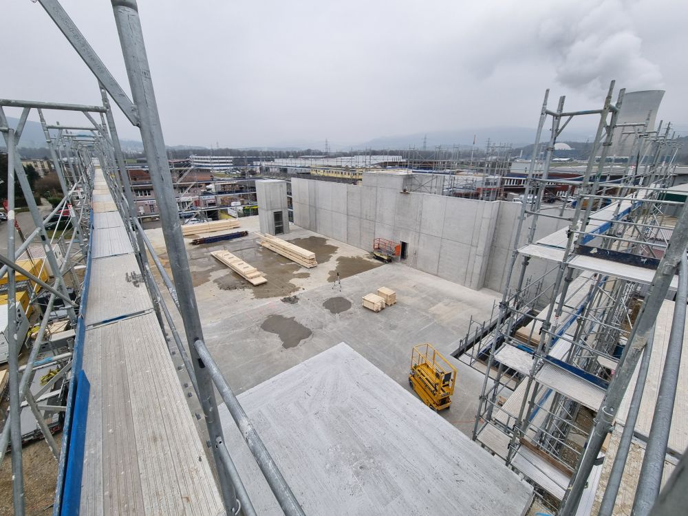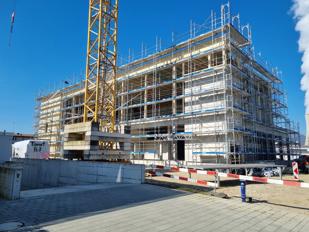 À l’intérieur également, le bâtiment prend forme de manière visible : l’électricité, le chauffage et la ventilation sont déjà dans leur dernière phase, tandis que les structures définitives des espaces intérieurs se dessinent de plus en plus clairement.