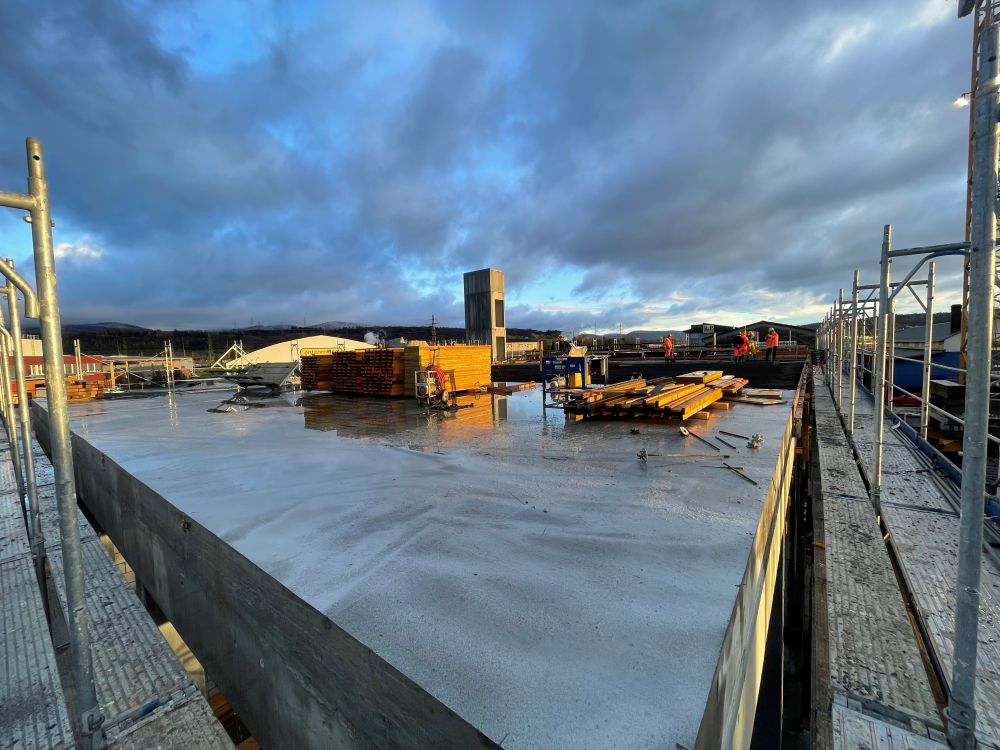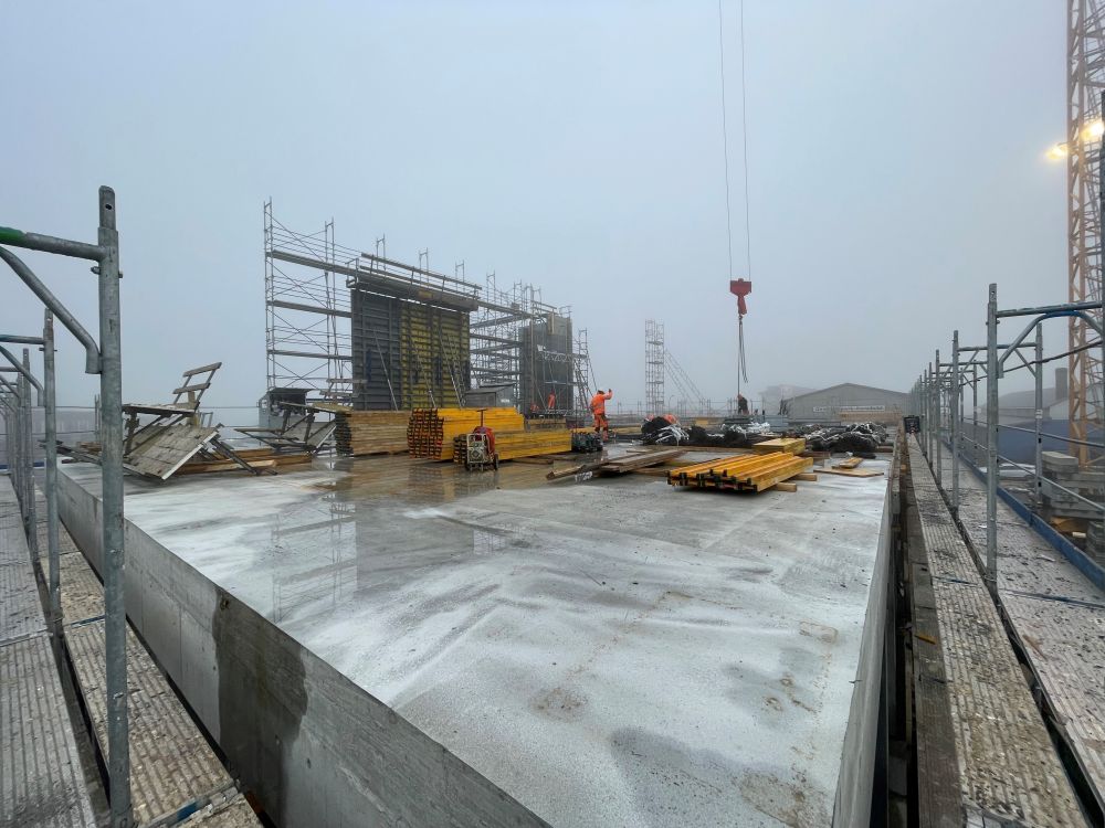 Nous approchons d'une étape importante : la dernière partie de la dalle au-dessus du rez-de-chaussée est bétonnée ! Ensuite, les premiers travaux de finition, comme le décoffrage et le nettoyage, commenceront.