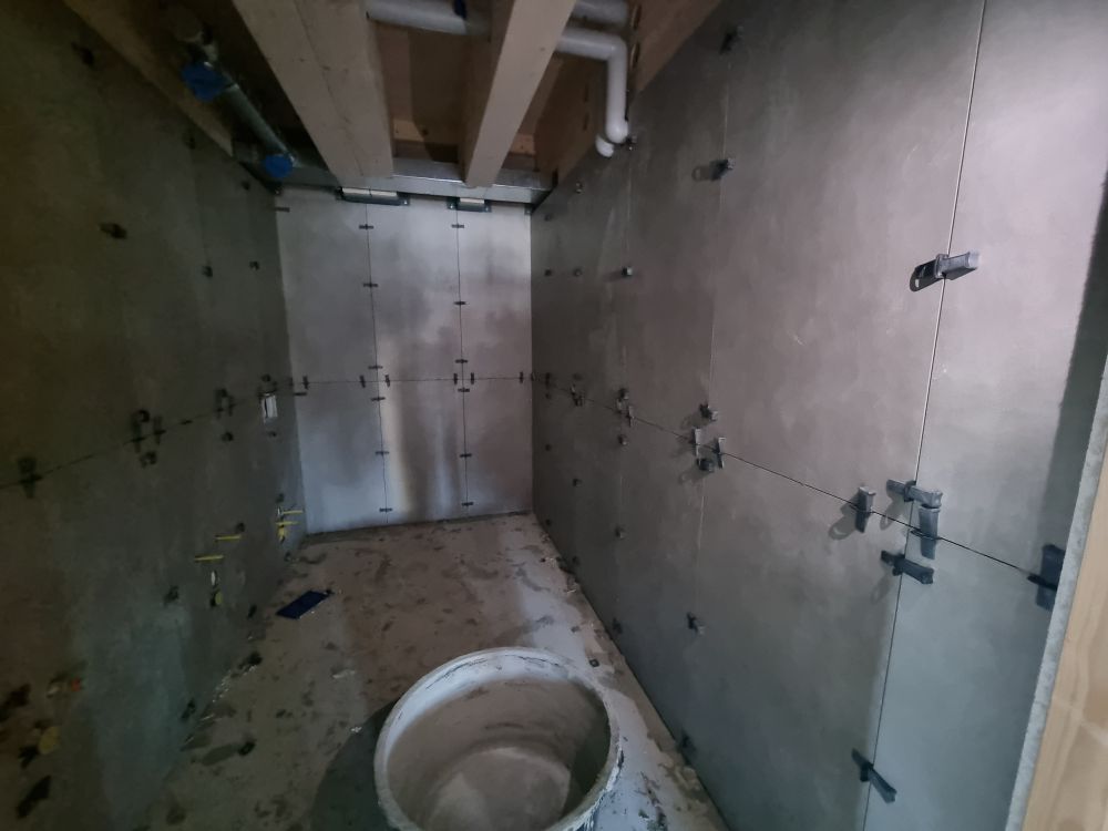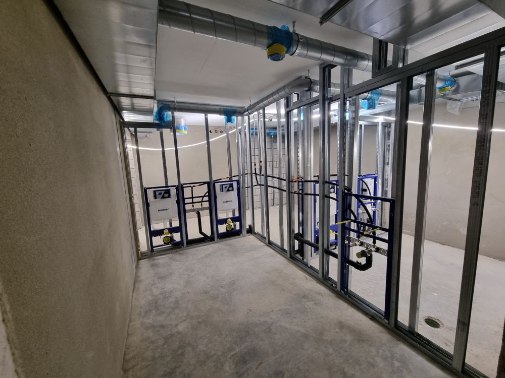 Actuellement, la priorité est donnée à l’entreprise de ventilation, en raison de ses besoins importants en espace. Parallèlement, le plâtrier monte les cloisons préfabriquées dans certaines zones, tandis que l’installateur sanitaire commence à mettre en place les premiers éléments.