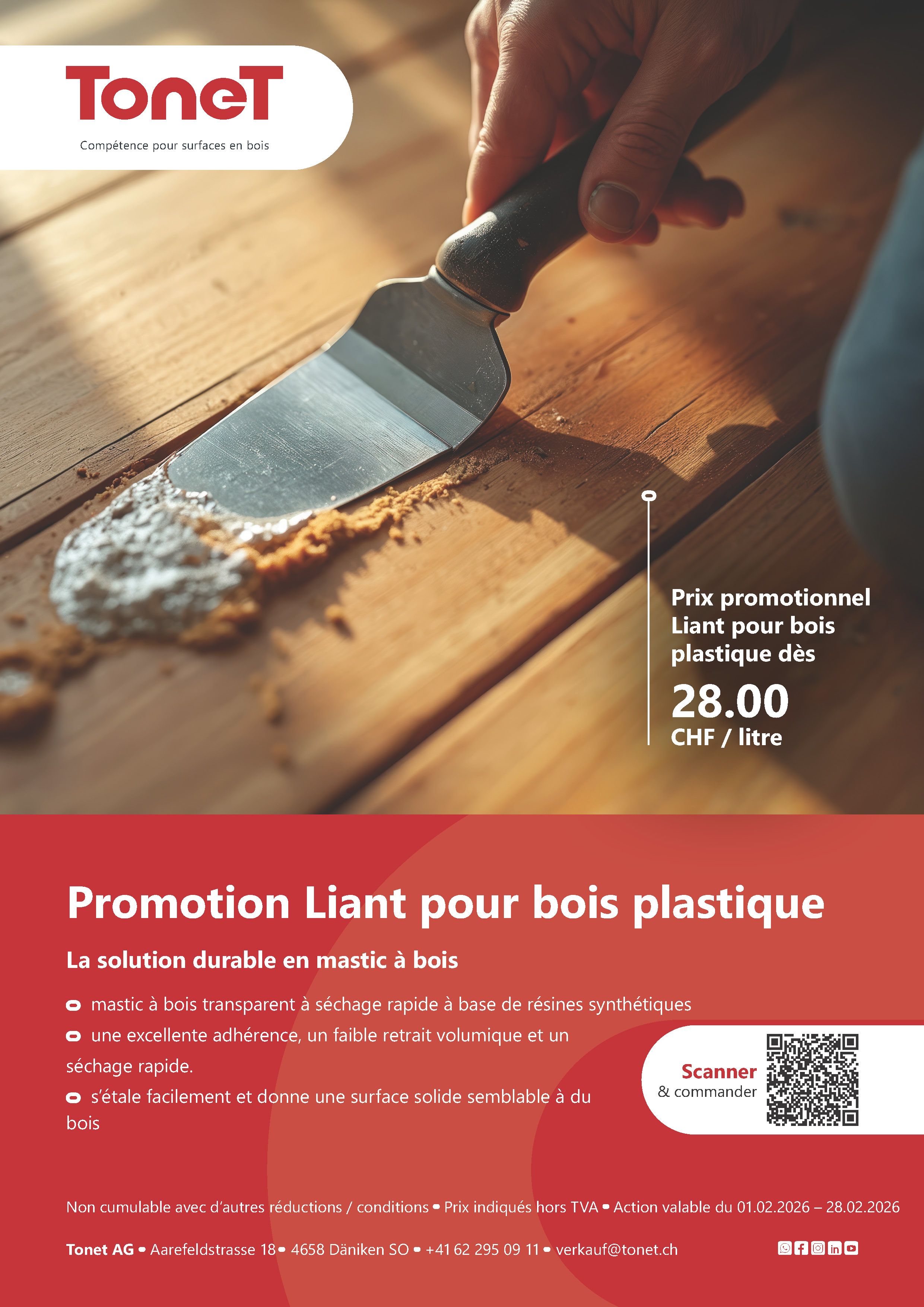 Jusqu'au 28 février 2026, profitez d'une remise de 25 % sur notre liant pour bois plastique. Pour l'achat de 3 x 1 l ou 2 x 5 l, vous bénéficiez même d'une remise de 30 %.